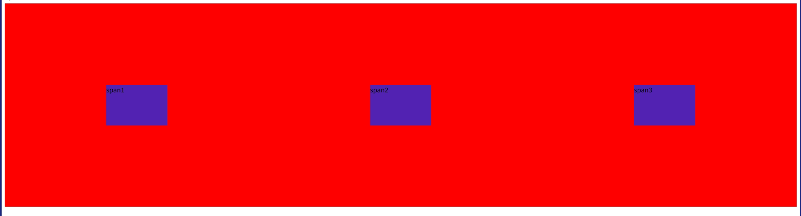 <head><meta charset="UTF-8"><meta name="viewport" content="width=device-width, initial-scale=1.0"><title>Document</title><style>div {background-color: red;width: 100%;height: 500px;display: flex;justify-content: space-around;/* 垂直居中 */align-items: center;}div span {width: 150px;height: 100px;background-color: rgb(82, 34, 179);