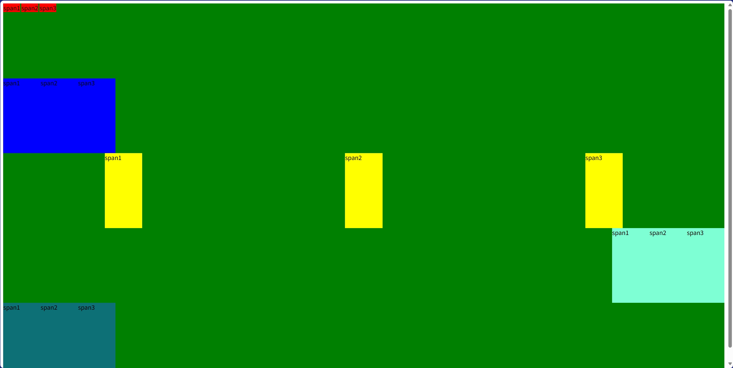 <head><meta charset="UTF-8"><meta name="viewport" content="width=device-width, initial-scale=1.0"><title>Document</title><style>div {width: 100%;height: 200px;background-color: green;}.div1 span {width: 100px;background-color: red;}.div2 {display: flex;}.div2 span {width: 100px;background-color: blue;}.div3 {display: flex;justify-content: space-around;}.div3 span {width: 100px;background-color: yellow;}.div4 {display: flex;justify-content: flex-end;}.div4 span {width: 100px;background-color: aquamarine;}.div5 {display: flex;justify-content: flex-start;}.div5 span {width: 100px;background-color: rgb(13, 112, 118);}</style>