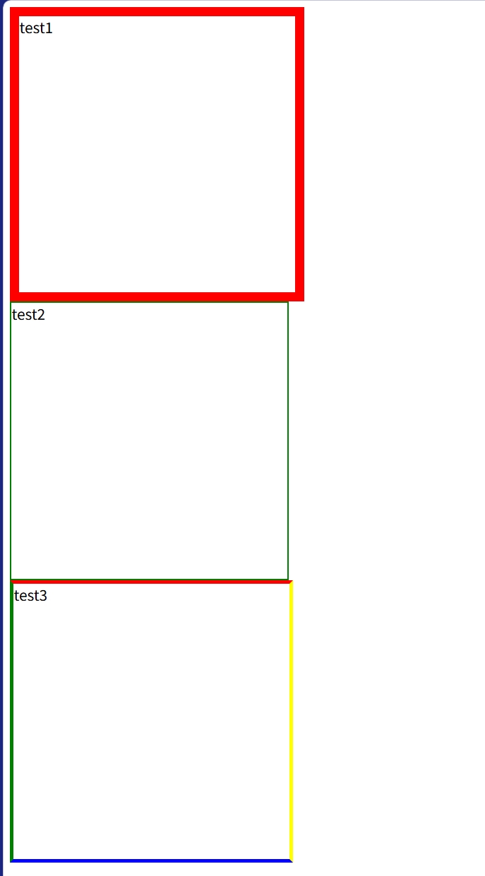 <head><meta charset="UTF-8"><meta name="viewport" content="width=device-width, initial-scale=1.0"><title>Document</title><style>.size {width: 300px;height: 300px;}.test1 {border-style: solid;border-width: 10px;border-color: red;}.test2 {border: solid 2px green;}.test3 {border-top: red;border-bottom: blue;border-left: green;border-right: yellow;border-style: solid;border-width: 4px;}</style>