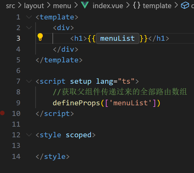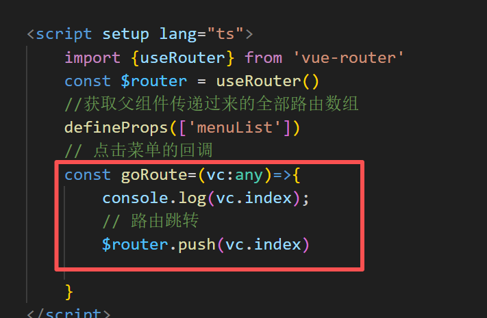 </template><script setup lang="ts">//获取父组件传递过来的全部路由数组defineProps(['menuList'])// 点击菜单的回调const goRoute=(vc:any)=>{console.log(vc.index);}