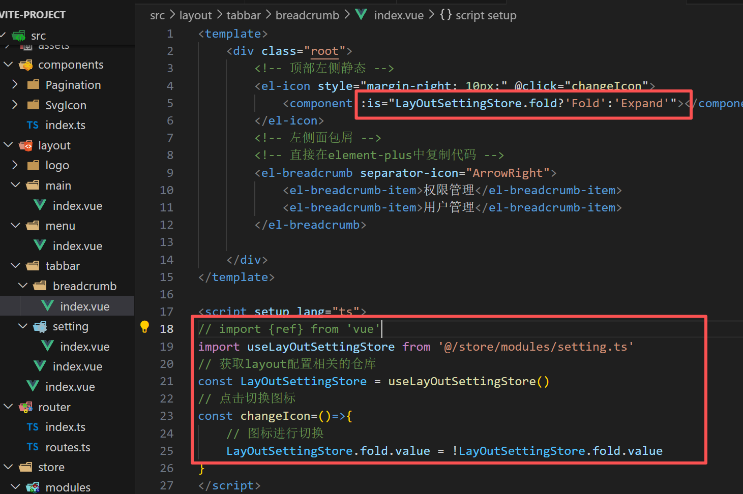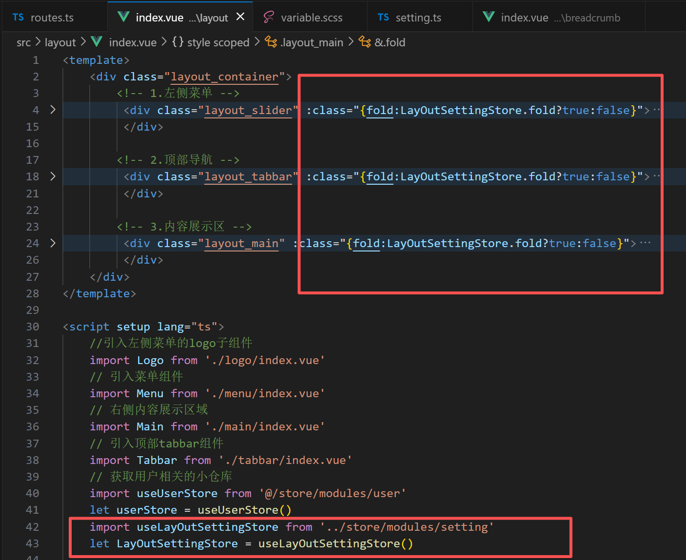祖组件引入小仓库里面的LayOutSettingStore,加一个类,若为true,类生效,为false,类不生效