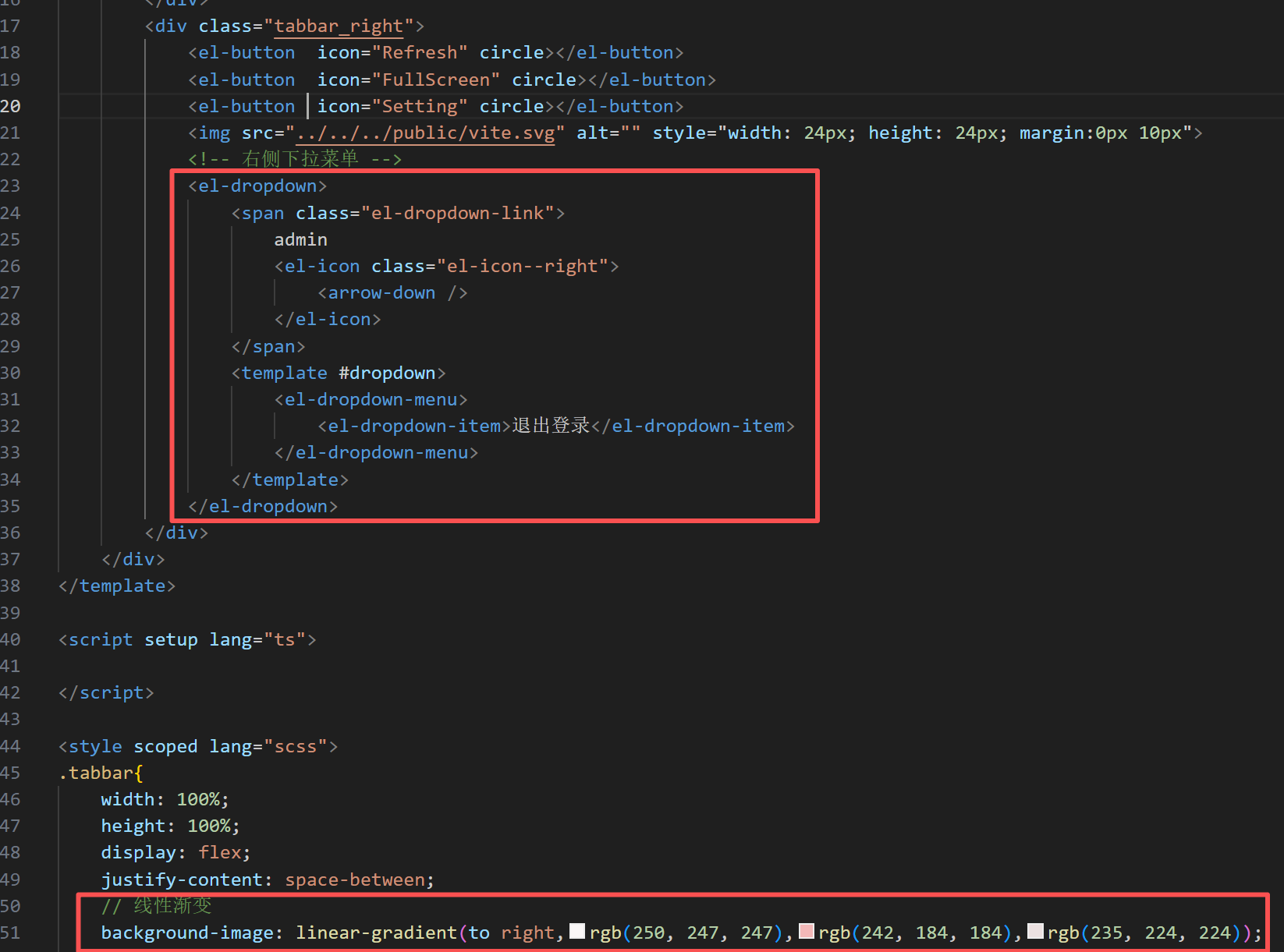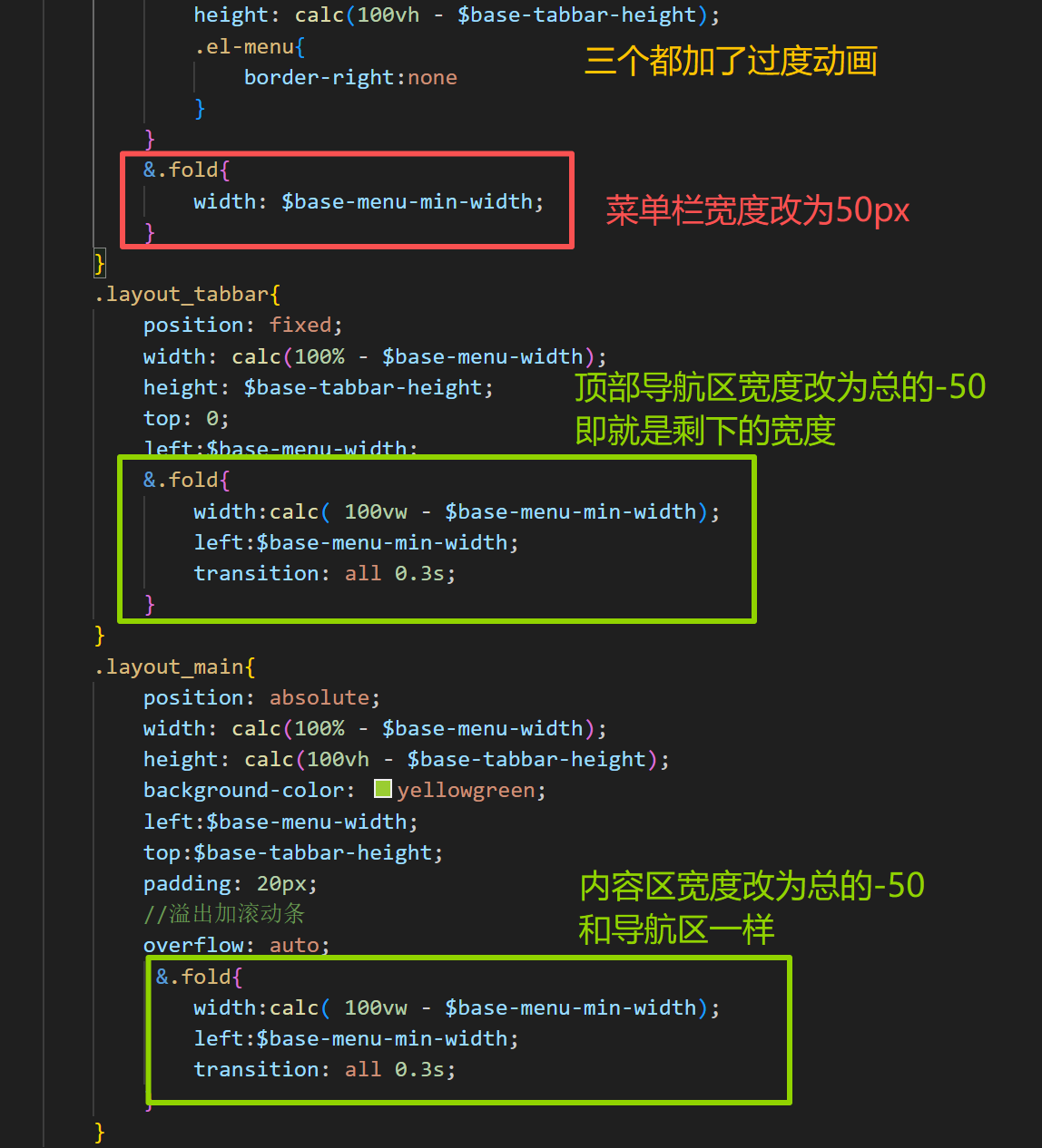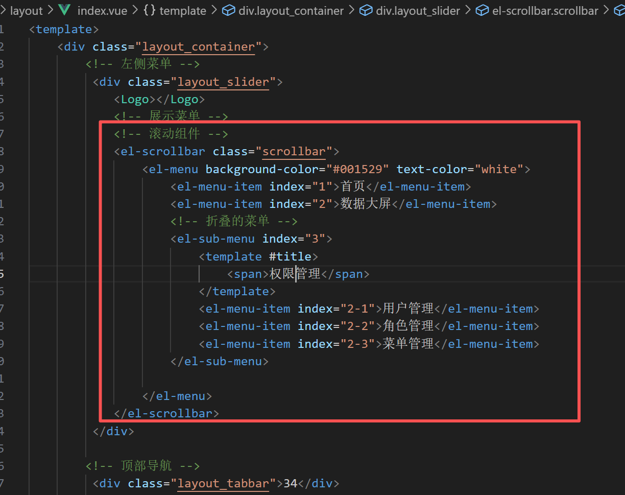 </template><script setup lang="ts"></script><style scoped lang="scss">.layout_container{width: 100%;height: 100vh;}.layout_slider{width: $base-menu-width;//全局变量height: 100vh;background-color: $base-menu-background;//全局变量}.layout_tabbar{position: fixed;width: calc(100% - $base-menu-width);//全局变量height: $base-tabbar-height;//全局变量background: cyan;top: 0;left:$base-menu-width//全局变量}.layout_main{position: absolute;width: calc(100% - $base-menu-width);height: calc(100vh - $base-tabbar-height);background-color: yellowgreen;left:$base-menu-width;top:$base-tabbar-height;padding: 20px;//溢出加滚动条overflow: auto;}