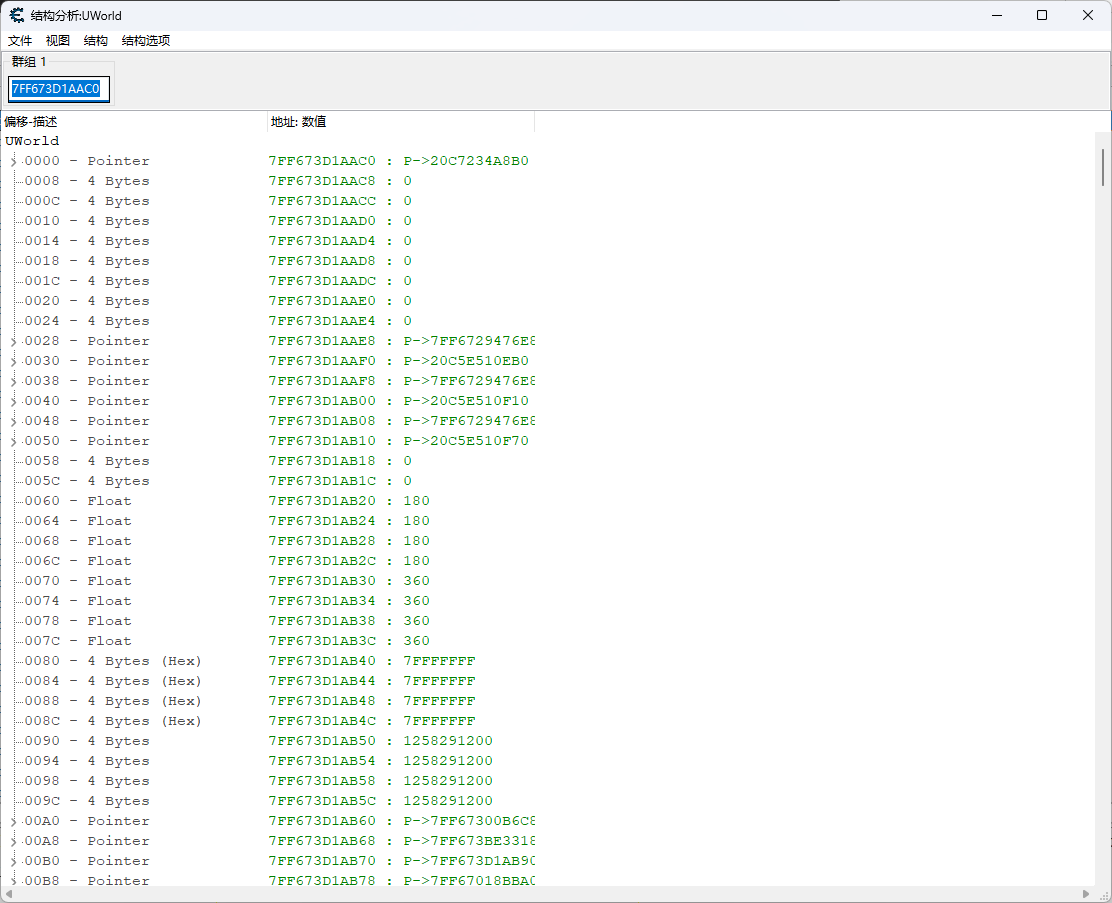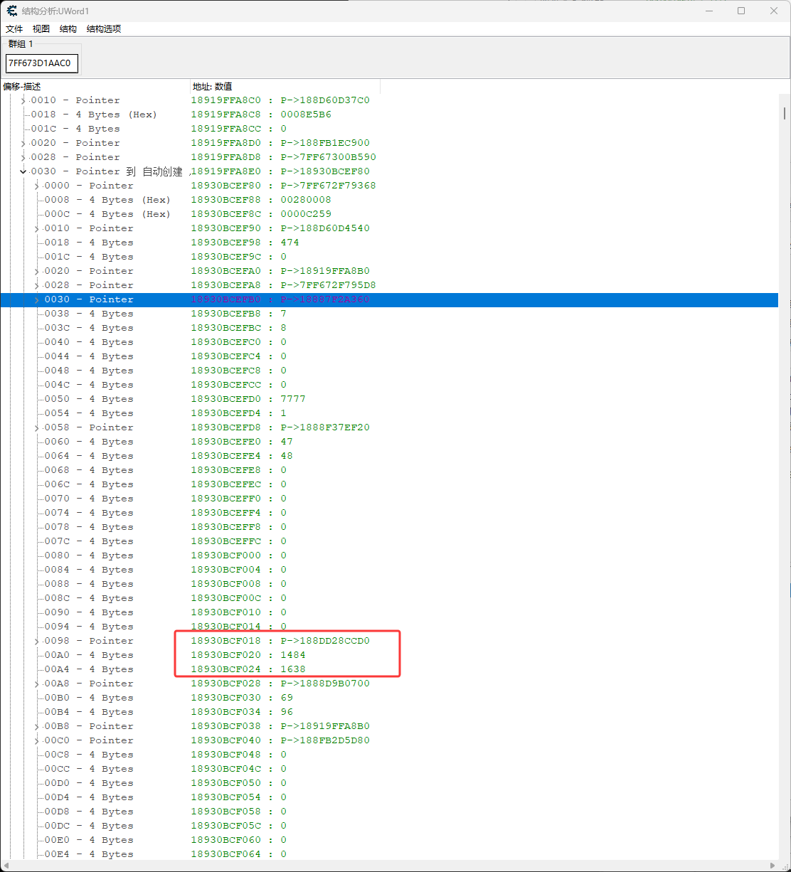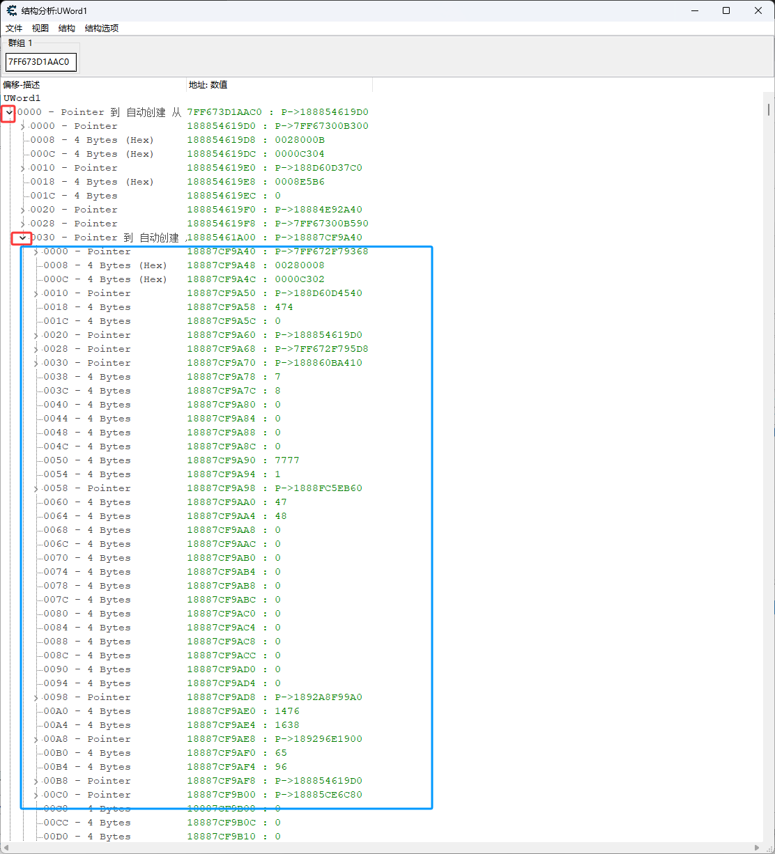 然后点开它,如下图红框就是游戏中的树、怪物、建筑物等,在游戏中可以看到的和看不到的都可以在这里找到,注意下图红框全是内存地址,AActor结构的内存地址,如果不是内存地址说明CE分析错了,只需要右击选择指针类型即可