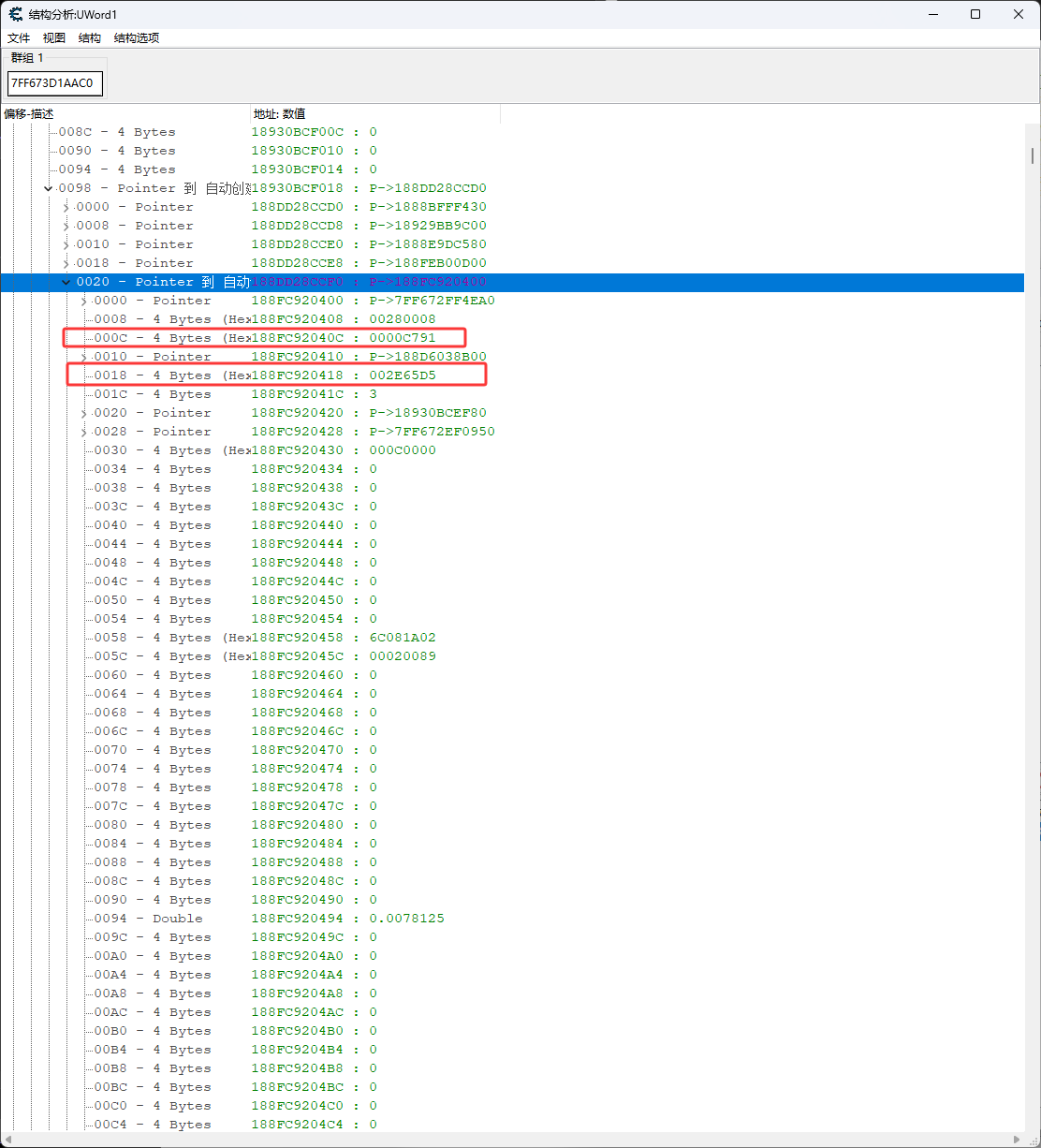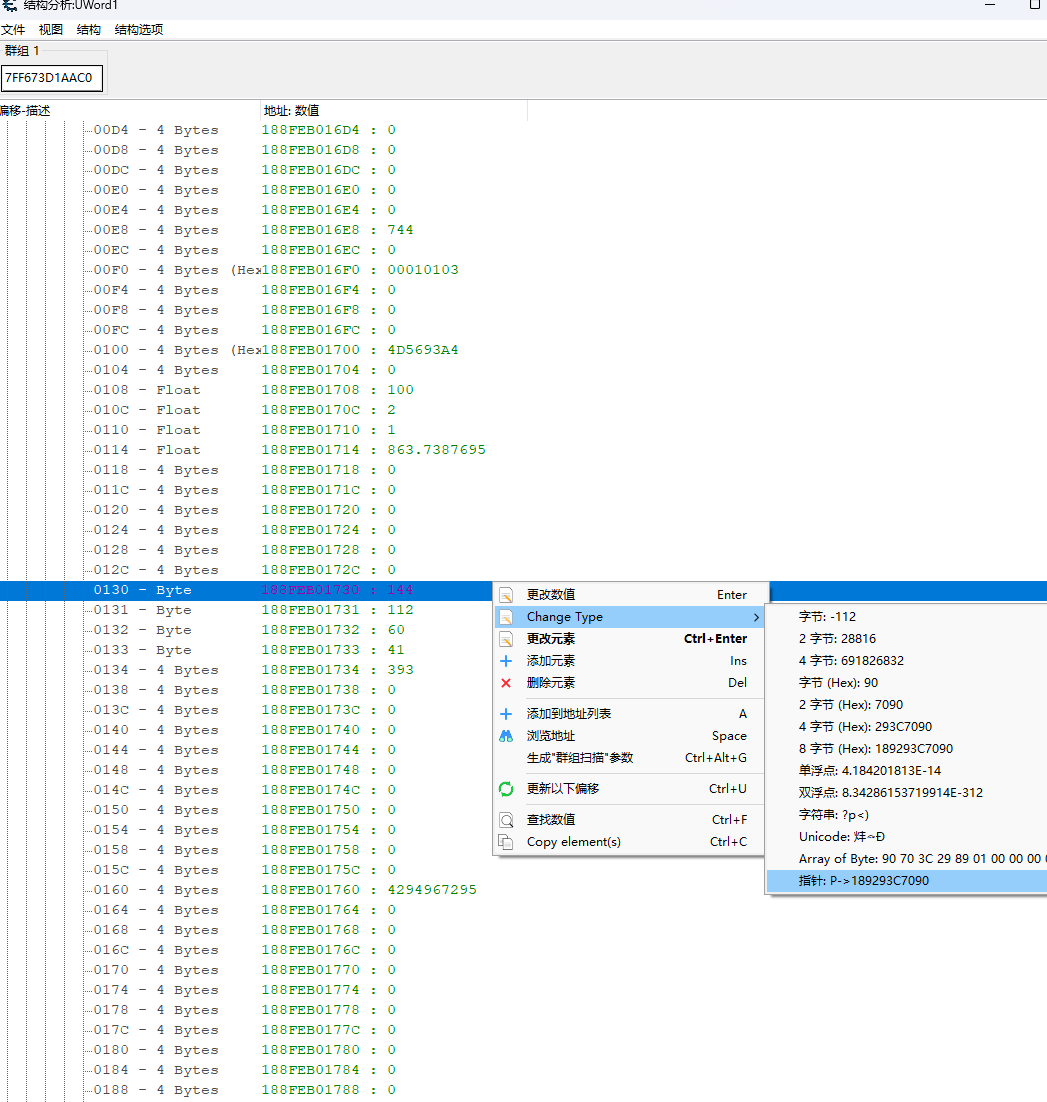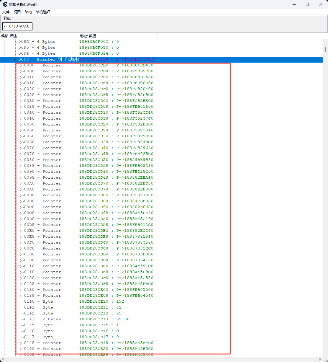 然后点开它,如下图红框就是游戏中的树、怪物、建筑物等,在游戏中可以看到的和看不到的都可以在这里找到,注意下图红框全是内存地址,AActor结构的内存地址,如果不是内存地址说明CE分析错了,只需要右击选择指针类型即可