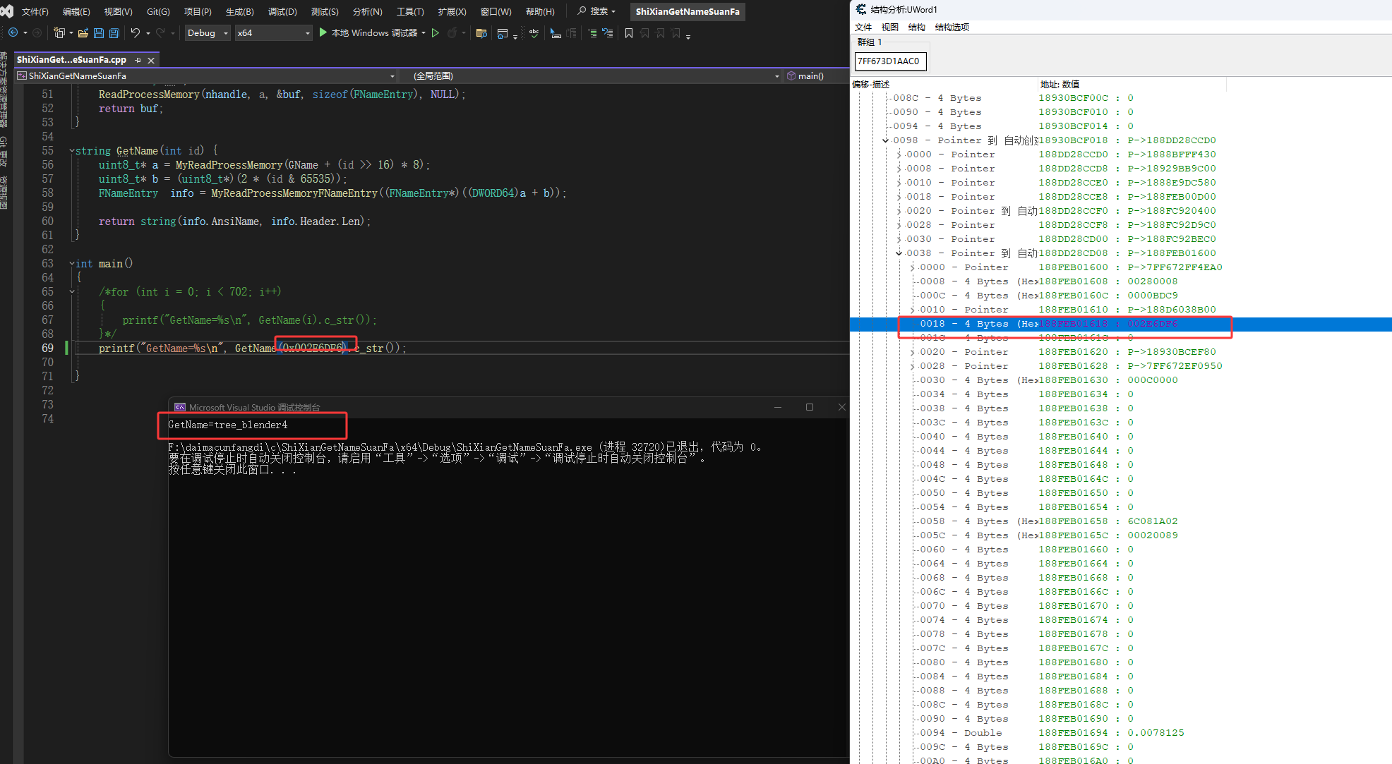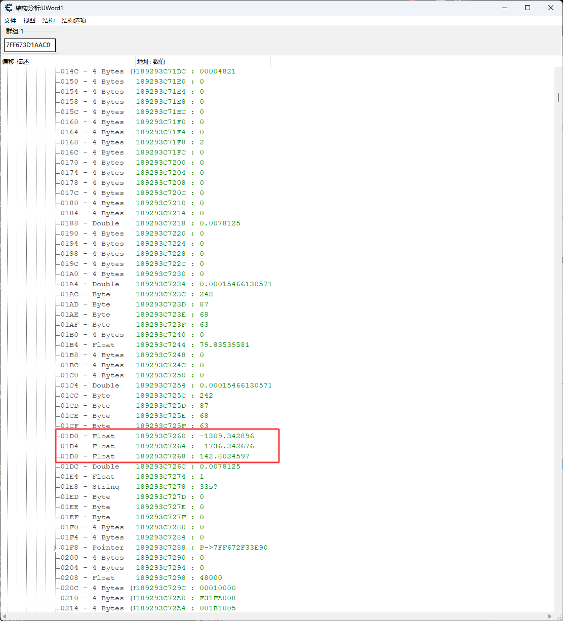 然后在0x1D0位置就可以看到坐标了,游戏中树木很多,修改之后可能看不出什么效果,后面使用代码把它们全部遍历出来,然后再搞