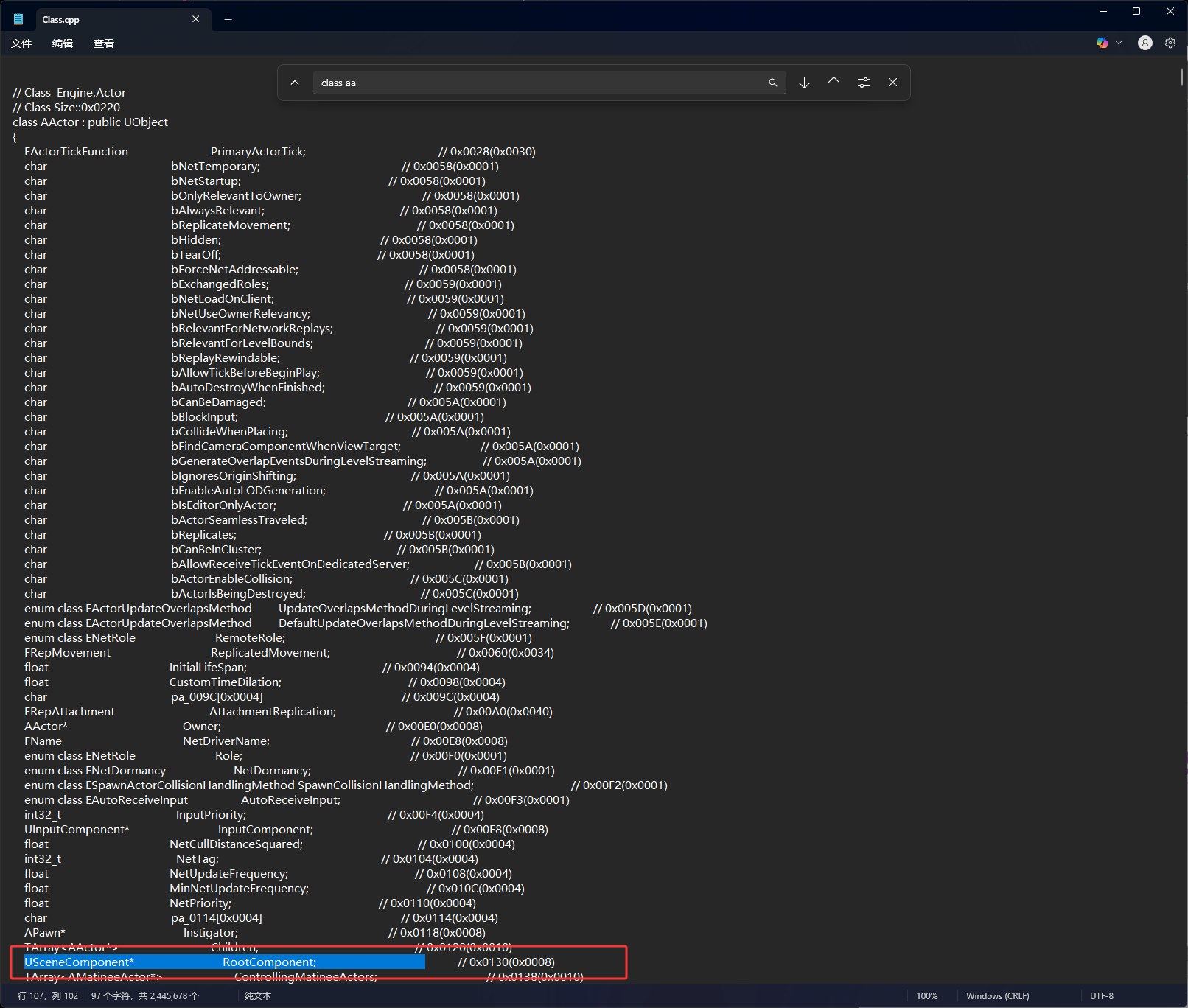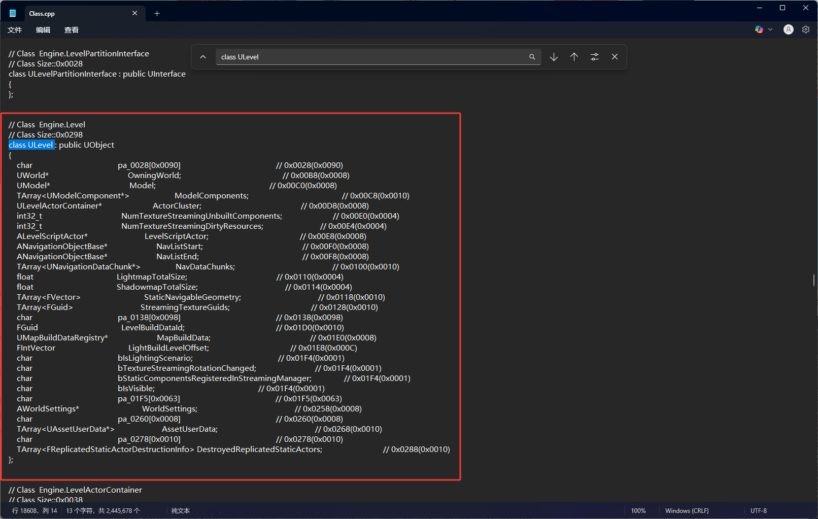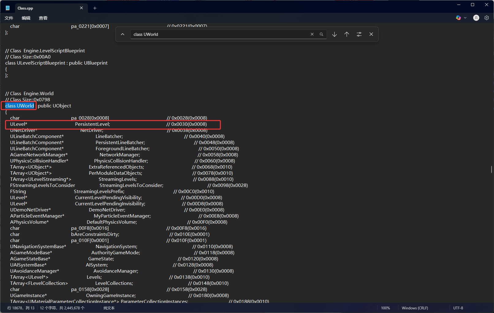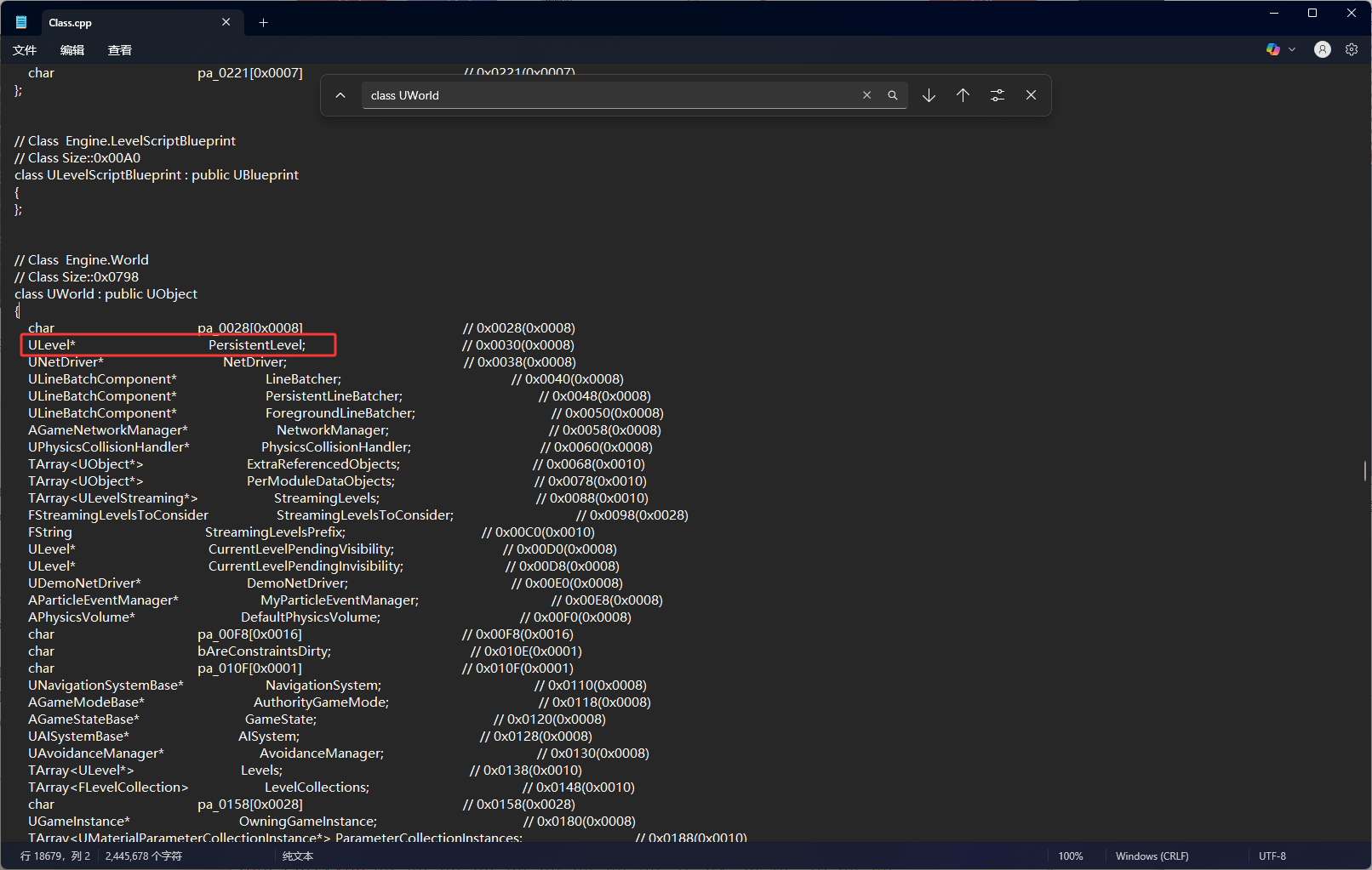 然后打开之前Dump的class,如下图找到ULevel的在UWorld中的偏移0x30