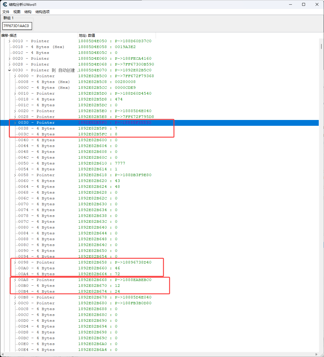 首先点击0x0位置,因为使用的是UWorld的地址找到的,需要看UWorld的内容,也就是内存地址里面的值,然后再点击0x30位置,如下图红框的,然后就可以看到下图蓝框的内容