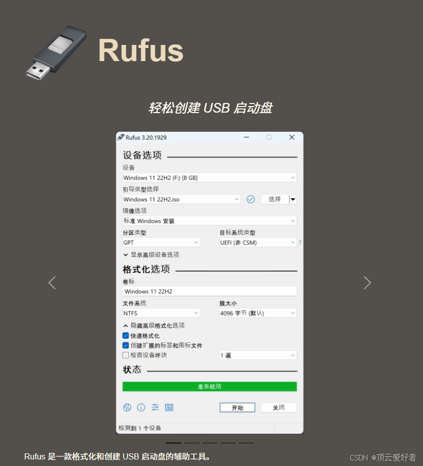 Rufus 是一款轻量、免费、无广告的启动盘制作工具,用来把 系统镜像(ISO) 写入 U 盘,从而制作出可以安装操作系统的 可启动设备。