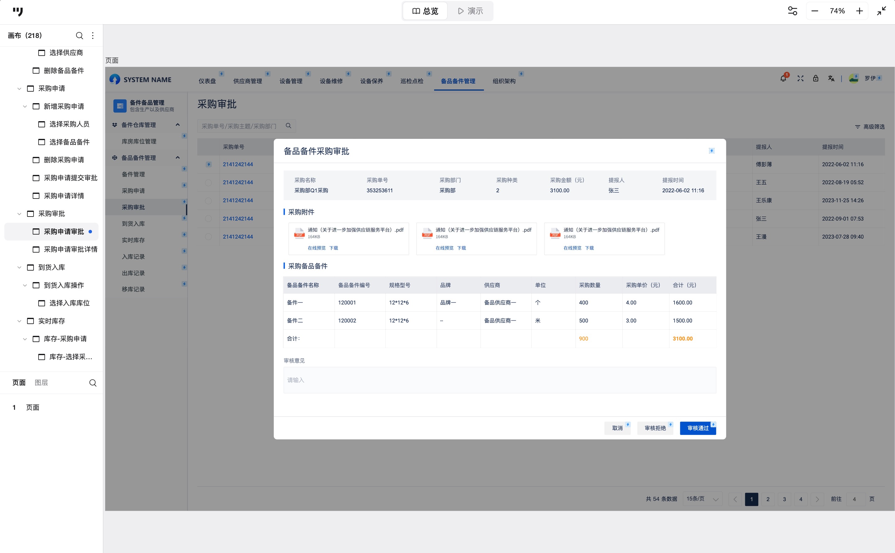 备品备件模块包含备件仓库管理与备件流转管理两部分,涵盖仓库、采购、入库、出库与库存管理等环节。例如其中一个关键环节:采购审批。页面设计简洁明了,在对采购审批时,弹窗展示具体信息: