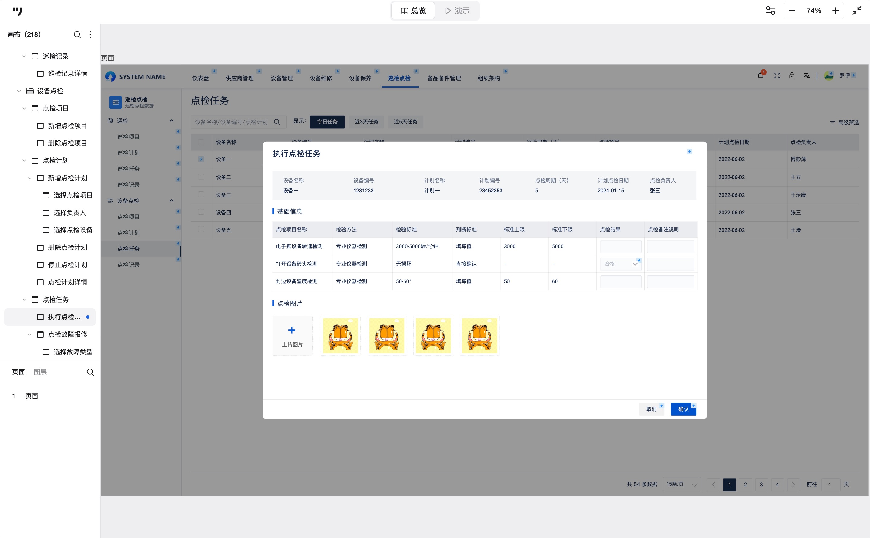 例如在点检任务页面,信息列表展示任务清单,选中任务后可执行“点检任务”或“点检报修”操作。在执行弹窗中,可填写点检结果(合格/不合格)、备注说明并上传点检照片,便于追溯记录。