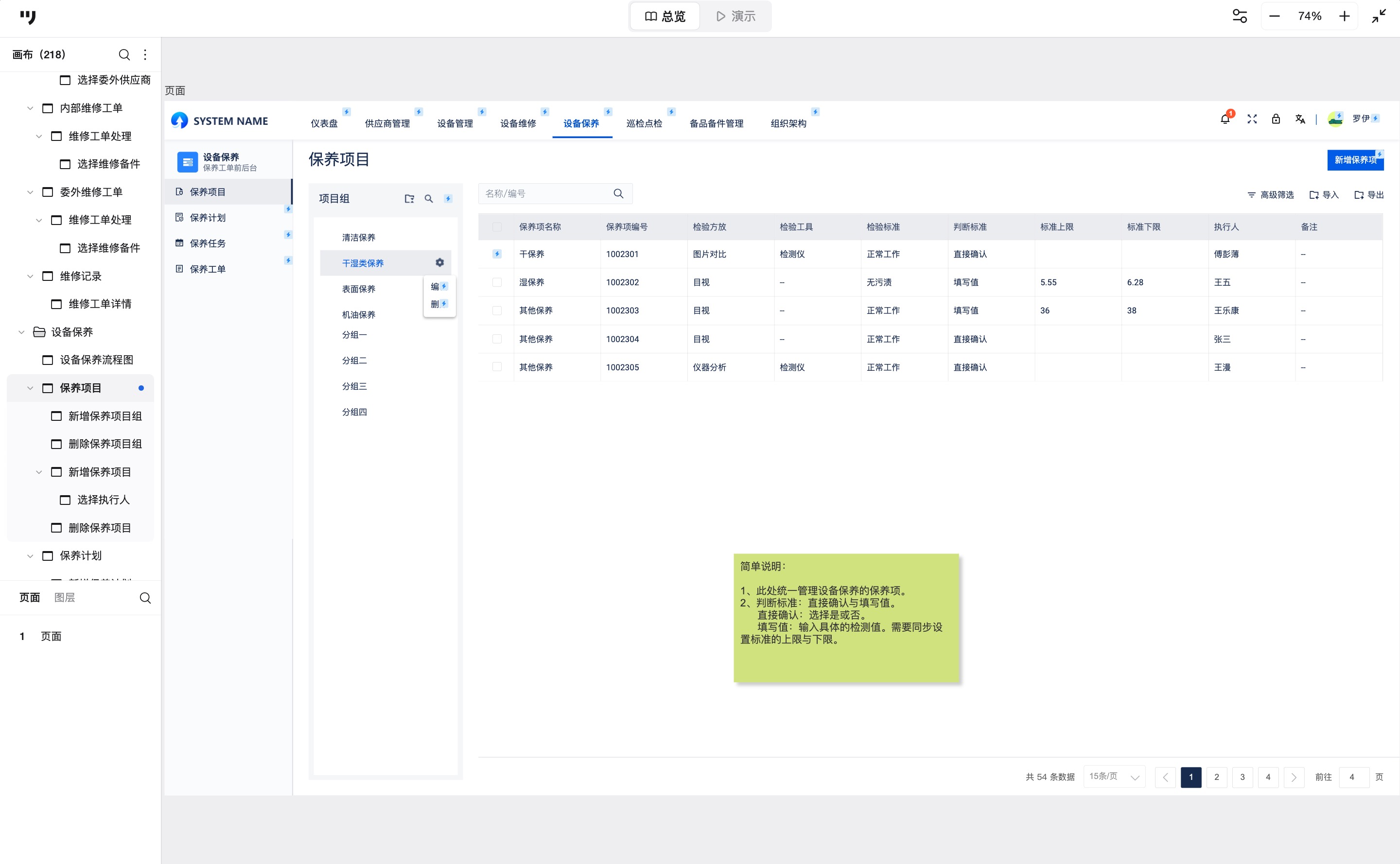 设备保养时确保设备正常运行、延长使用寿命和提高生产效率的重要措施。设备保养模块分为保养项目、保养计划、保养任务、保养工单四个功能页。如保养项目页面,左侧设有项目组分类竖栏,便于按照分组查询;右侧为对应保养项目信息列表。保养计划页面以信息列表形式展示,设有计划状态标签快捷筛选。