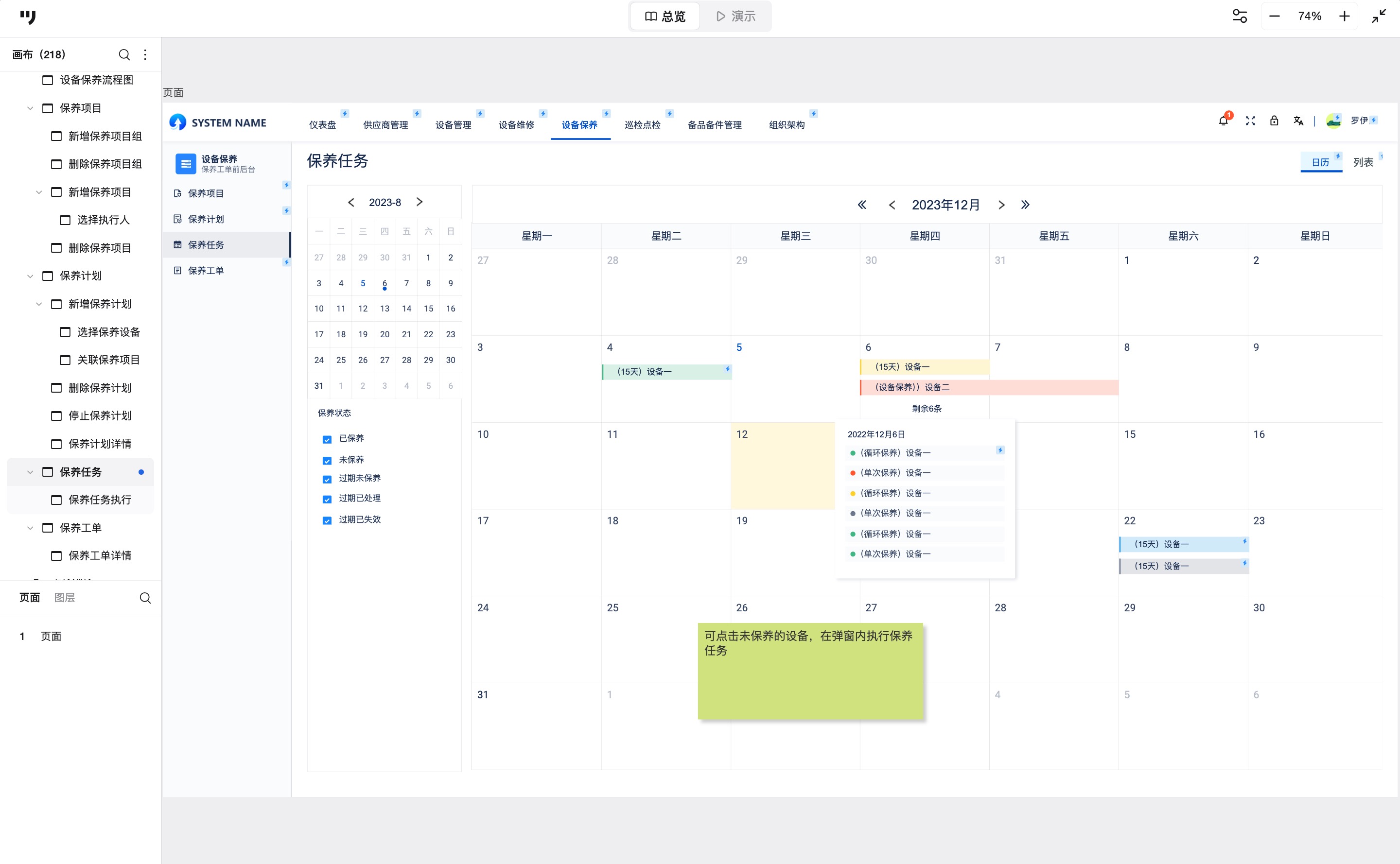 “保养任务”页面提供日历视图与列表视图双模式切换。左侧为日历缩略图与保养状态筛选框(保养中/未保养/过期未保养/已处理/已失效),右侧为详细任务视图。点击任务可查看设备详情,支持快速操作与视图切换。