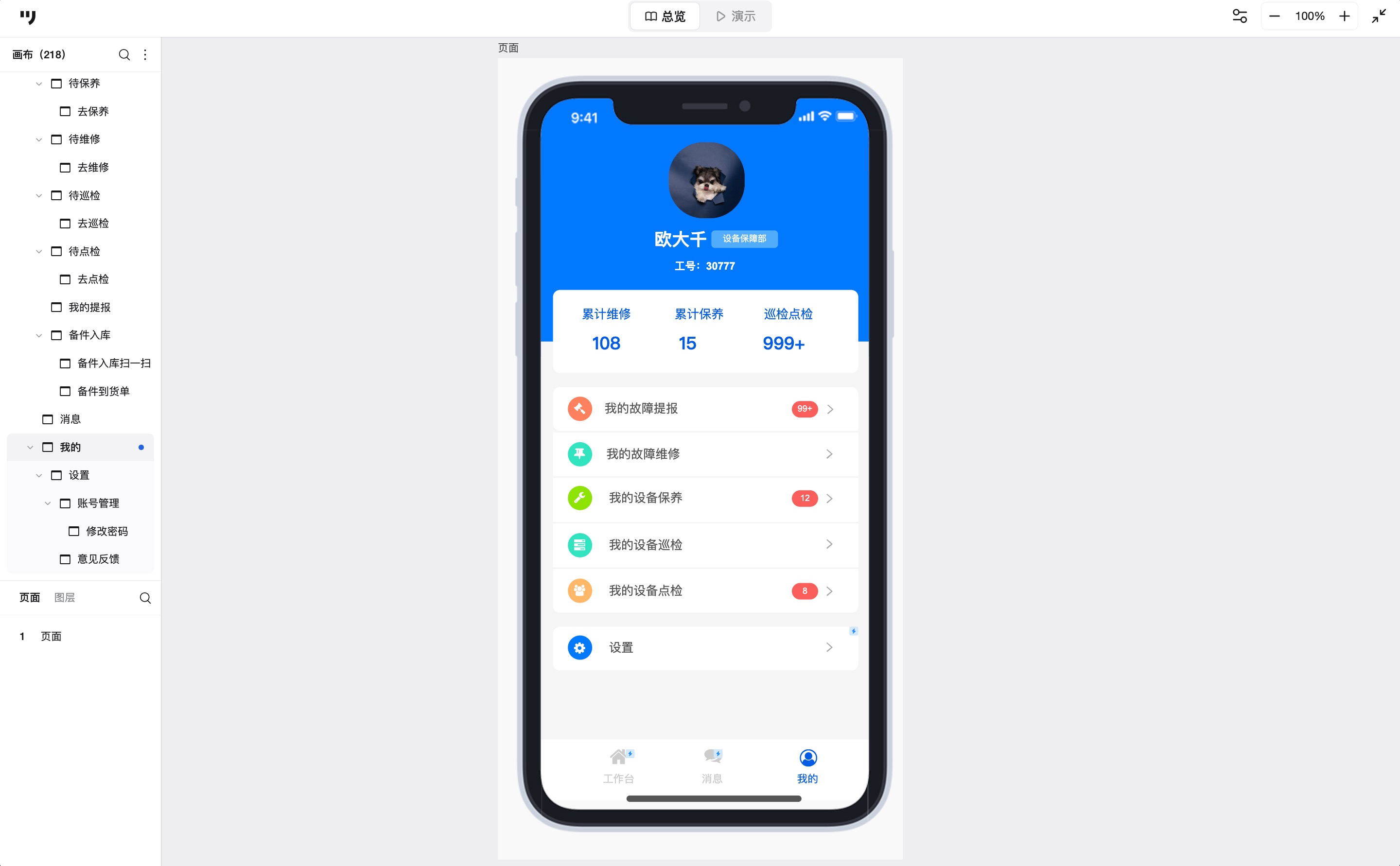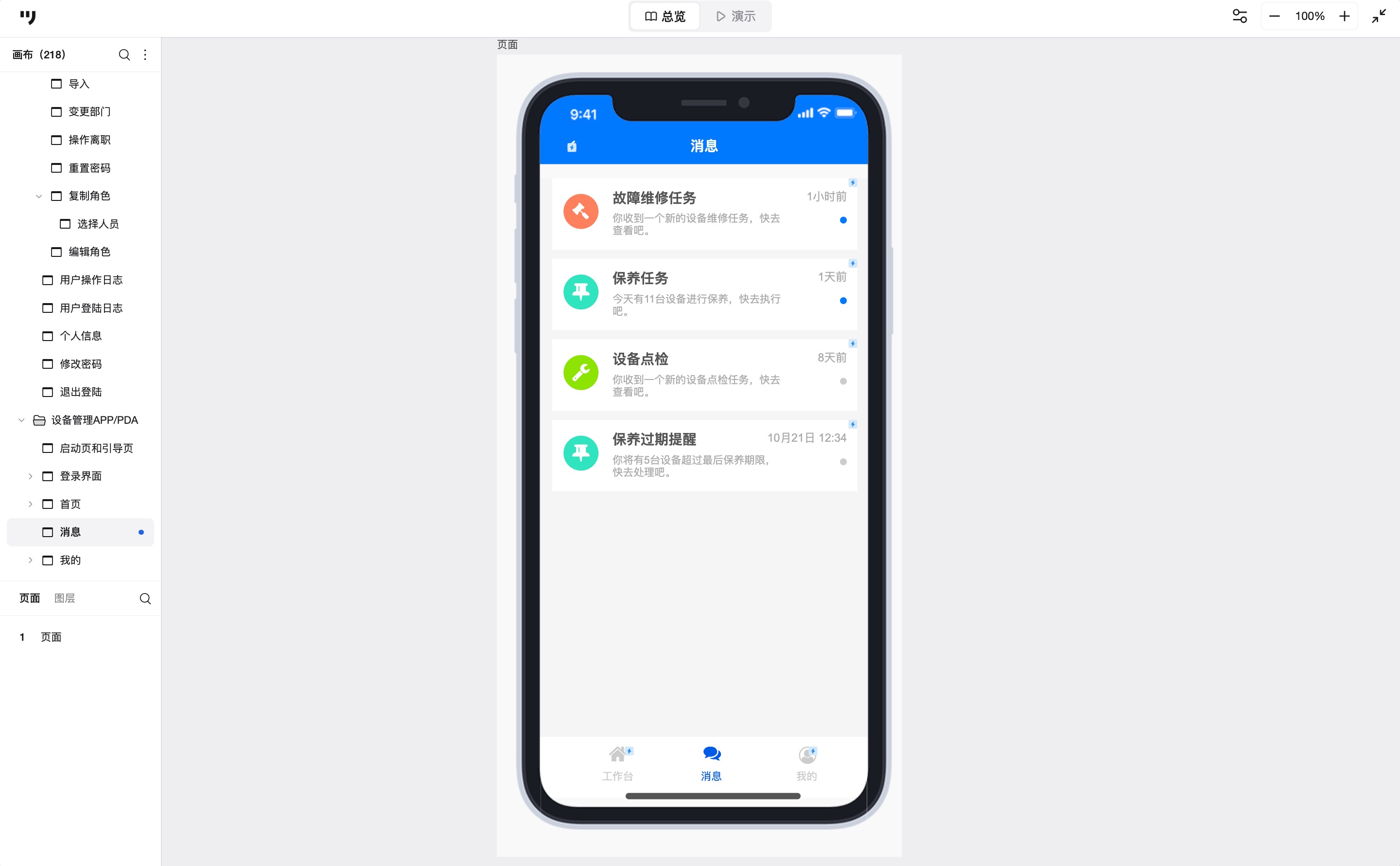 消息模块主要用于接收系统通知,分为四类信息,分别是:故障维修任务、保养任务、设备点检、保养过期提醒。界面简洁,支持快速定位与已读标记。