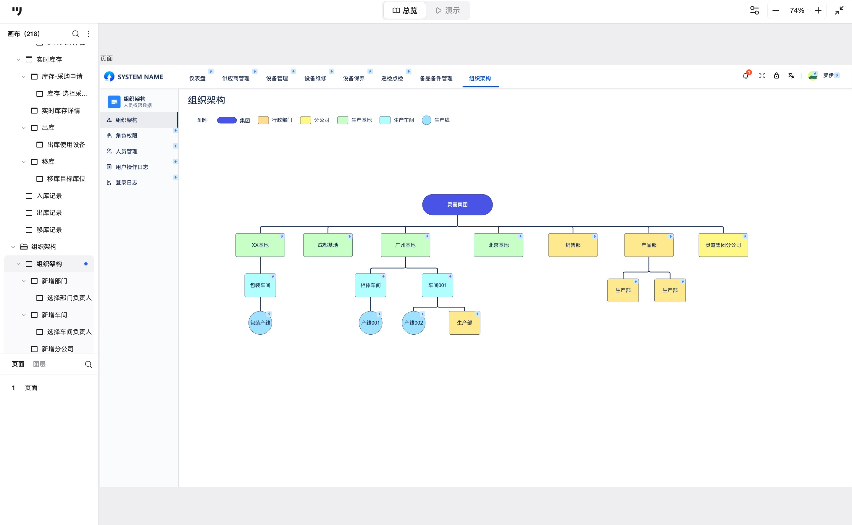 组织架构模块包括架构信息、角色权限、人员管理、操作日志与登录日志。组织架构页面提供可视化组织树结构,支持新增、编辑与删除部门或车间节点。