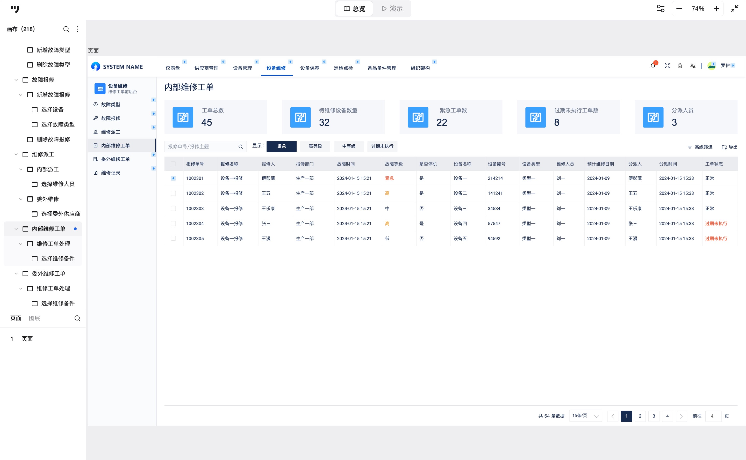 设备维修分为内部维修和委外维修,两个工单页面结构保持一致:顶部为统计卡片,展示工单总数、待维修设备数、紧急工单数与派工人数;下方为详细工单列表,支持按状态(紧急 / 高等级 / 中等级 / 过期未执行)筛选查看,方便快速响应关键任务。