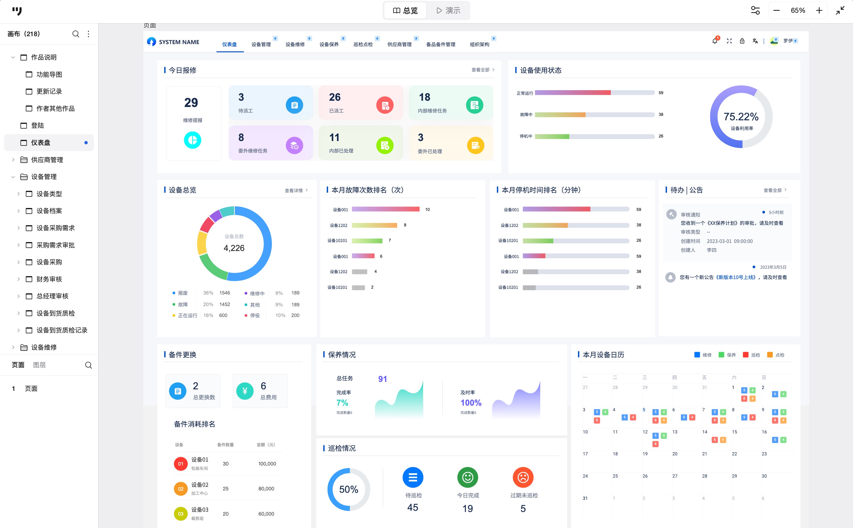 - 中部区域:由四个卡片构成,依次为:设备总览占比(环形饼图)、本月故障次数排名(横向柱状图)、本月停机时长排名、待办公告消息;