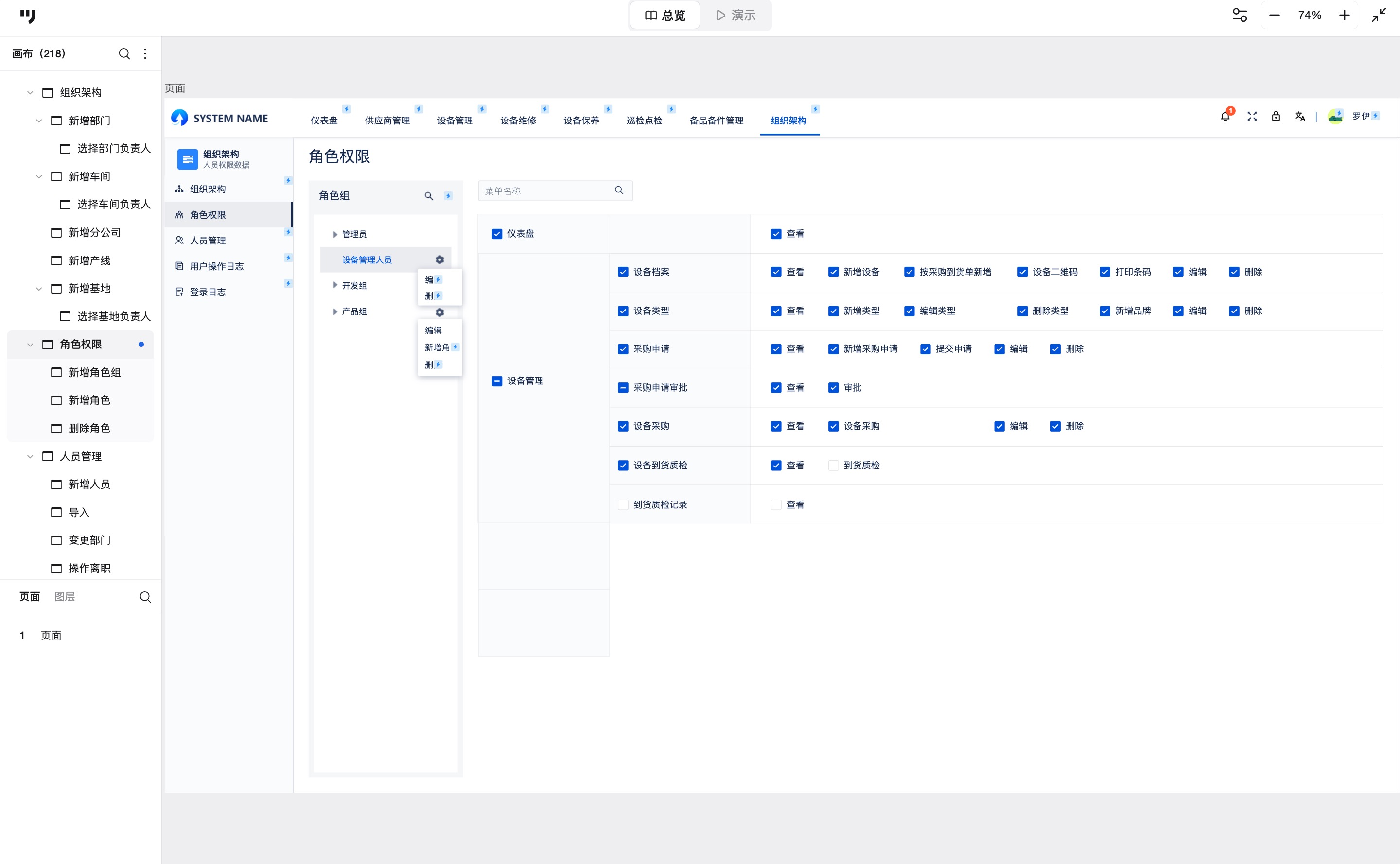对于角色权限的管理是非常有必要的,页面采用左侧角色组+右侧权限表格布局,可对整个组或者单个角色设置具体权限,可快速勾选权限项,操作直观,易于管理与扩展。