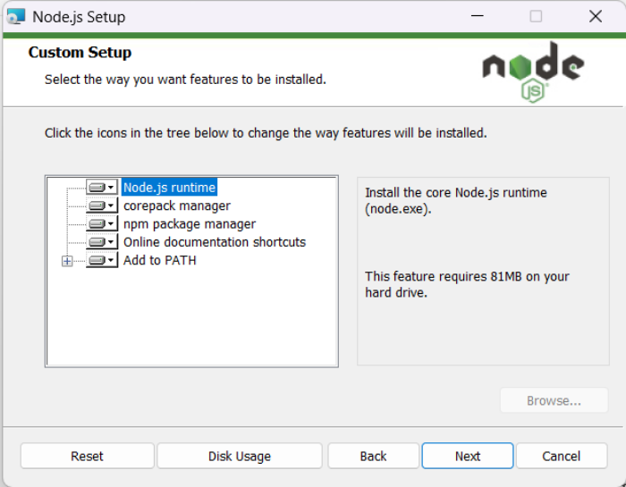 - Node.js runtime:Node.js 核心运行时(包含 node.exe),是运行 Node.js 程序的基础,必须安装。