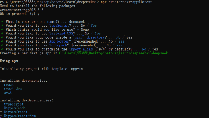 - 在命令行终端中执行:npx create-next-app@latest(此时是在正确的 命令行工具CLI 环境中,能识别 npx 命令)。
