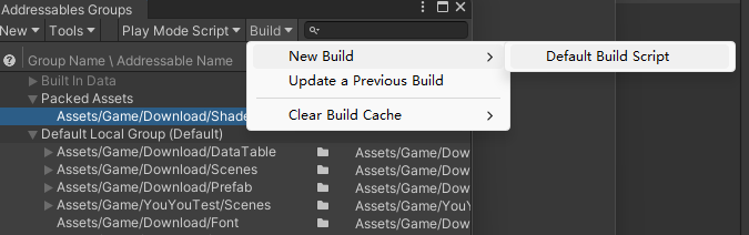 - 工作方式: 这是最标准的构建流程。它会分析所有 Addressable 资源,处理依赖关系,并生成所有必要的 AssetBundle 文件和 Content Catalog。