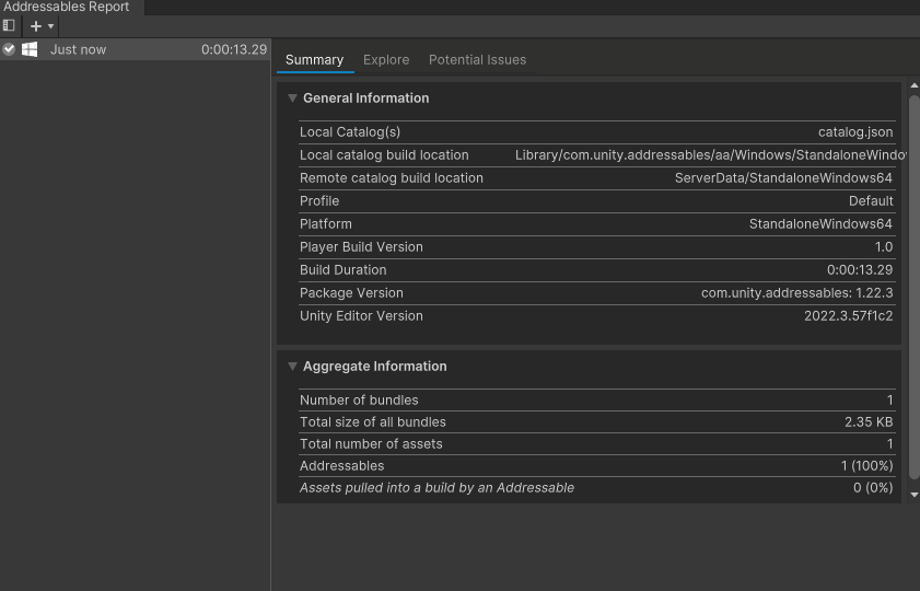 面板是一个静态分析工具,它提供了关于你的 Addressables 构建的详细统计信息和诊断报告。
