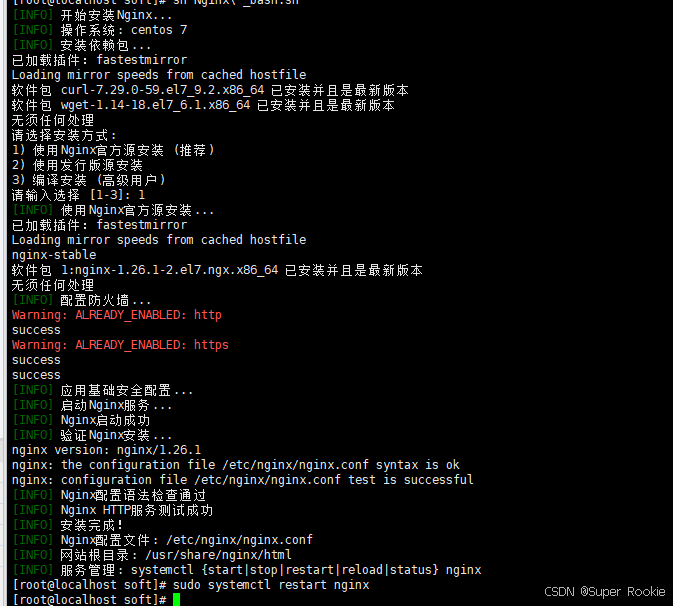 main() {log_info "开始安装Nginx..."# 检查root权限if [ "$EUID" -ne 0 ]; thenlog_error "请使用root权限运行此脚本"exit 1fidetect_osinstall_dependencies# 选择安装方式echo "请选择安装方式:"echo "1) 使用Nginx官方源安装 (推荐)"echo "2) 使用发行版源安装"echo "3) 编译安装 (高级用户)"read -p "请输入选择 [1-3]: " choicecase $choice in1)install_nginx_official;;2)install_nginx_distro;;3)compile_nginx;;*)log_info "使用默认选项: 官方源安装"install_nginx_official;;esacconfigure_firewallbasic_security_configstart_nginxverify_installation