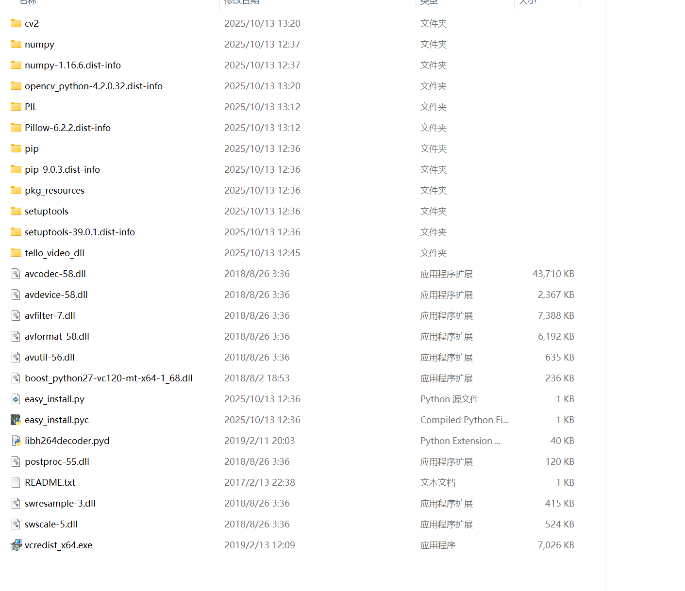 此外关于libh264decoder解决办法是把官方链接中的tello_video_dll(For win64).zip中的全部文件都挨个放在文件夹C:\Python27\lib\site-packages文件夹下面,如下图所示: