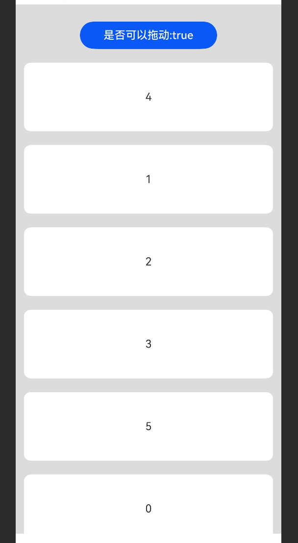 export struct Index {@State private arr: number[] = [0, 1, 2, 3, 4, 5, 6, 7, 8, 9]@State dragItem: number = -1 // 当前拖拽的项目@State scaleItem: number = -1 // 当前缩放的项目@State neighborItem: number = -1 // 相邻项目@State neighborScale: number = -1 // 相邻项目的缩放比例private dragRefOffset: number = 0 // 拖拽参考偏移@State offsetX: number = 0 // 偏移量@State offsetY: number = 0private itemIntv: number = 120 // 项目间隔@State moveControls: boolean = false // 控制拖拽功能scaleSelect(item: number): number {if (this.scaleItem == item) {return 1.05} else if (this.neighborItem == item) {return this.neighborScale} else {return 1}}itemMove(index: number, newIndex: number): void {let tmp = this.arr.splice(index, 1)this.arr.splice(newIndex, 0, tmp[0])}build() {Stack() {Column() {Button('是否可以拖动:' + !this.moveControls).width(200).margin(20).onClick(() => {this.moveControls = !this.moveControls})List({ space: 20, initialIndex: 0 }) {ForEach(this.arr, (item: number) => {ListItem() {Text('' + item).width('100%').height(100).fontSize(16).textAlign(TextAlign.Center).borderRadius(10).backgroundColor(0xFFFFFF)// 通过状态变量scaleItem判断是否为组件添加阴影效果.shadow(this.scaleItem == item ? {radius: 70,color: '#15000000',offsetX: 0,offsetY: 0} : {radius: 0,// 阴影半径为0,相当于没有阴影color: '#15000000',offsetX: 0,offsetY: 0})// 设置锐利曲线动画,持续时间为300毫秒.animation({ curve: Curve.Sharp, duration: 300 })}.draggable(this.moveControls).margin({ left: 12, right: 12 }).scale({ x: this.scaleSelect(item), y: this.scaleSelect(item) })// 增加x轴、y轴缩放效果.zIndex(this.dragItem == item ? 1 : 0)// 设置组件的堆叠顺序,实现拖拽过程中被拖拽组件覆盖其他组件的效果.translate(this.dragItem == item ? { y: this.offsetY } : { y: 0 }).gesture(// 以下组合手势为顺序识别,当长按手势事件未正常触发时则不会触发拖动手势事件GestureGroup(GestureMode.Sequence,// 长按手势识别LongPressGesture({ repeat: true }).onAction((event?: GestureEvent) => { // 长按手势识别成功回调// 设置显示动画为阻尼曲线,持续时间为300毫秒animateTo({ curve: Curve.Friction, duration: 300 }, () => {this.scaleItem = item})})// 长按手势识别成功,最后一根手指抬起后触发回调.onActionEnd(() => {// 设置显示动画为阻尼曲线,持续时间为300毫秒animateTo({ curve: Curve.Friction, duration: 300 }, () => {this.scaleItem = -1})}),// 设置滑动手势事件,任意滑动方向都能够触发事件,触发滑动手势事件的最小滑动距离为0PanGesture({ fingers: 1, direction: null, distance: 0 })// 滑动手势识别成功回调.onActionStart(() => {this.dragItem = itemthis.dragRefOffset = 0})// 滑动手势移动过程中回调.onActionUpdate((event: GestureEvent) => {this.offsetY = event.offsetY - this.dragRefOffsetthis.neighborItem = -1let index = this.arr.indexOf(item)let curveValue = curves.initCurve(Curve.Sharp)let value: number = 0// 根据位移计算相邻项的缩放if (this.offsetY < 0 && index > 0) {value = curveValue.interpolate(-this.offsetY / this.itemIntv)this.neighborItem = this.arr[index-1]this.neighborScale = 1 - value / 20console.info('neighborScale:' + this.neighborScale.toString())} else if (this.offsetY > 0 && index < this.arr.length - 1) {value = curveValue.interpolate(this.offsetY / this.itemIntv)this.neighborItem = this.arr[index+1]this.neighborScale = 1 - value / 20}// 根据位移交换排序if (this.offsetY > this.itemIntv / 2 && index < this.arr.length - 1) {// 设置显式动画曲线animateTo({ curve: curves.interpolatingSpring(0, 1, 400, 38) }, () => {this.offsetY -= this.itemIntvthis.dragRefOffset += this.itemIntvthis.itemMove(index, index + 1)})} else if (this.offsetY < -this.itemIntv / 2 && index > 0) {animateTo({ curve: curves.interpolatingSpring(0, 1, 400, 38) }, () => {this.offsetY += this.itemIntvthis.dragRefOffset -= this.itemIntvthis.itemMove(index, index - 1)})}})// 滑动手势识别成功,手指抬起后触发回调.onActionEnd((event: GestureEvent) => {console.info(this.arr.toString())animateTo({ curve: curves.interpolatingSpring(0, 1, 400, 38) }, () => {this.dragItem = -1this.neighborItem = -1})animateTo({curve: curves.interpolatingSpring(14, 1, 170, 17), delay: 150}, () => {this.scaleItem = -1})}))// 滑动手势识别成功,接收到触摸取消事件触发回调.onCancel(() => {animateTo({ curve: curves.interpolatingSpring(0, 1, 400, 38) }, () => {this.dragItem = -1this.neighborItem = -1})animateTo({curve: curves.interpolatingSpring(14, 1, 170, 17), delay: 150}, () => {this.scaleItem = -1})}))// 设置页面转场时的纵向的平移距离}, (item: number) => item.toString())}.layoutWeight(1)}.width('100%').height('100%').backgroundColor(0xDCDCDC).padding({ top: 5 })}}