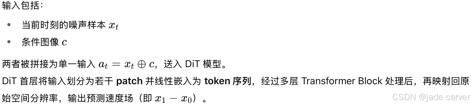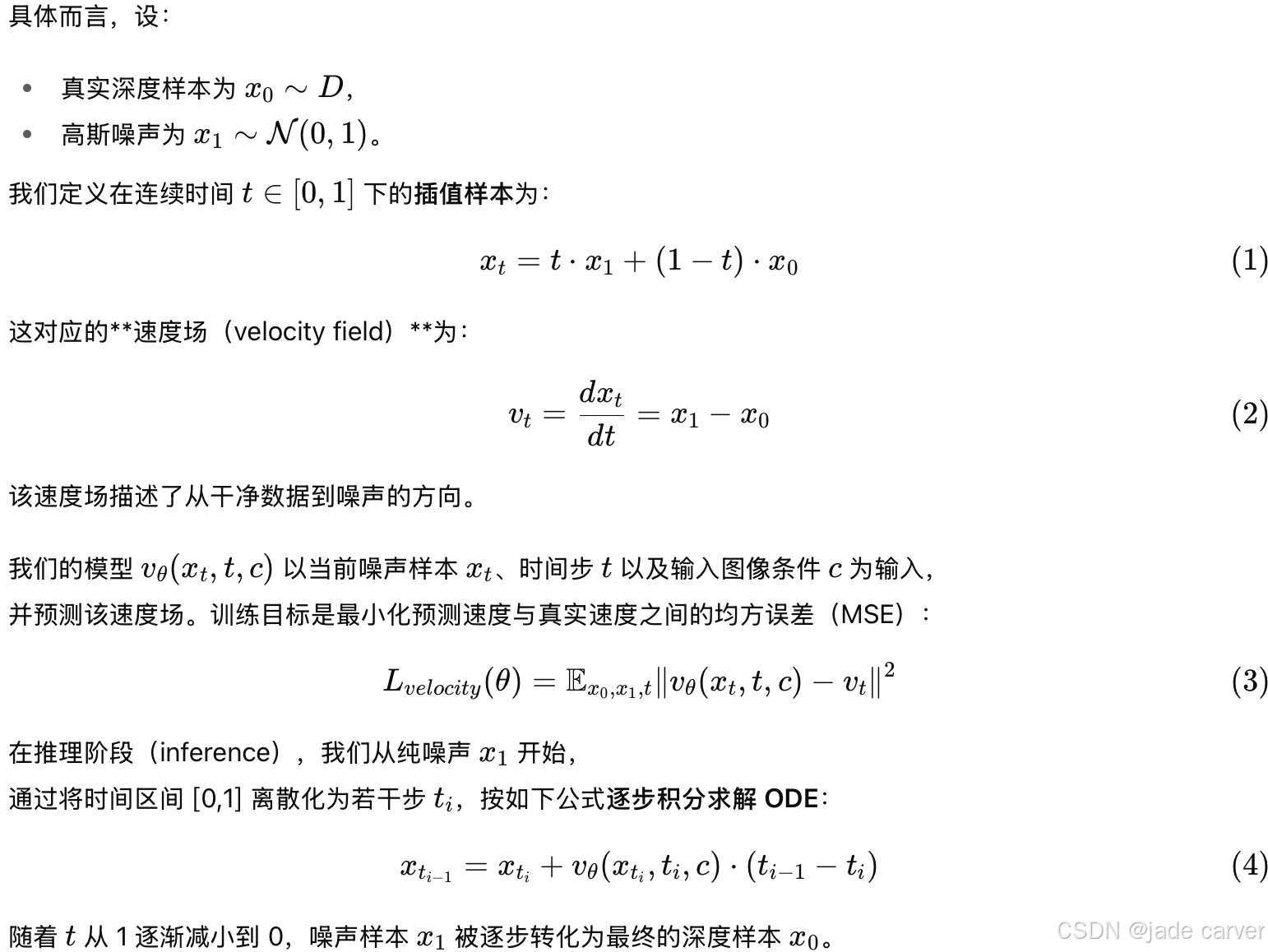 Flow Matching 作为生成机制,它学习一个从噪声到深度图的连续变换函数。与扩散模型类似,但直接建模速度场(流场),不需要计算噪声残差或概率密度。