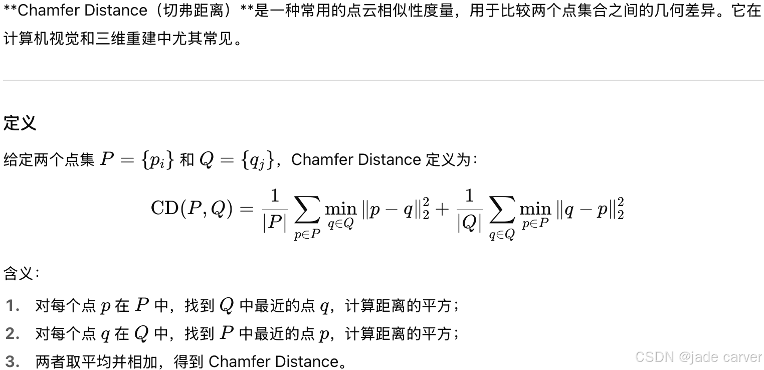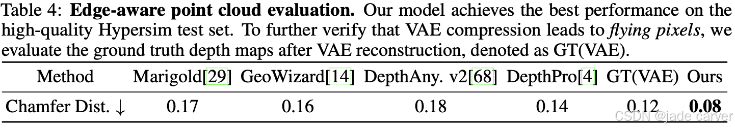 现有评估基准和指标(如 NYUv2、KITTI 的 AbsRel、δ1)多集中于平坦区域,难以反映边缘飞点问题。为此,我们在 Hypersim [44] 官方测试集上进行评估,该数据集提供高质量的真实点云,且未用于训练。我们使用 Canny 算子从真值深度图中提取边缘掩码,并在这些边缘附近计算预测点云与真值点云的 Chamfer Distance,从而量化边缘深度精度。