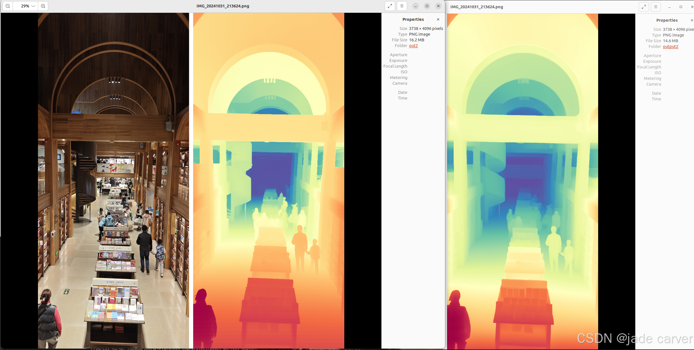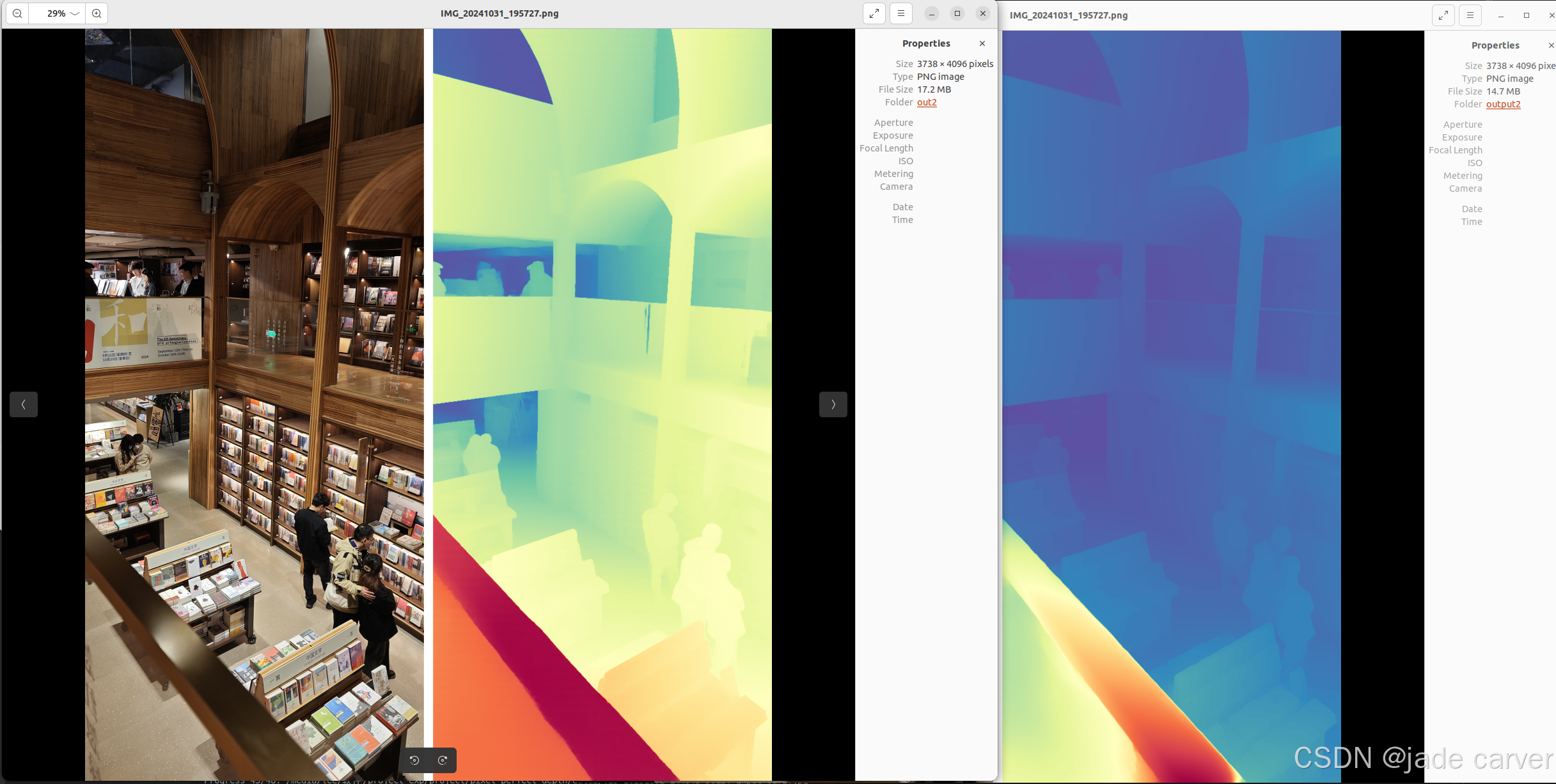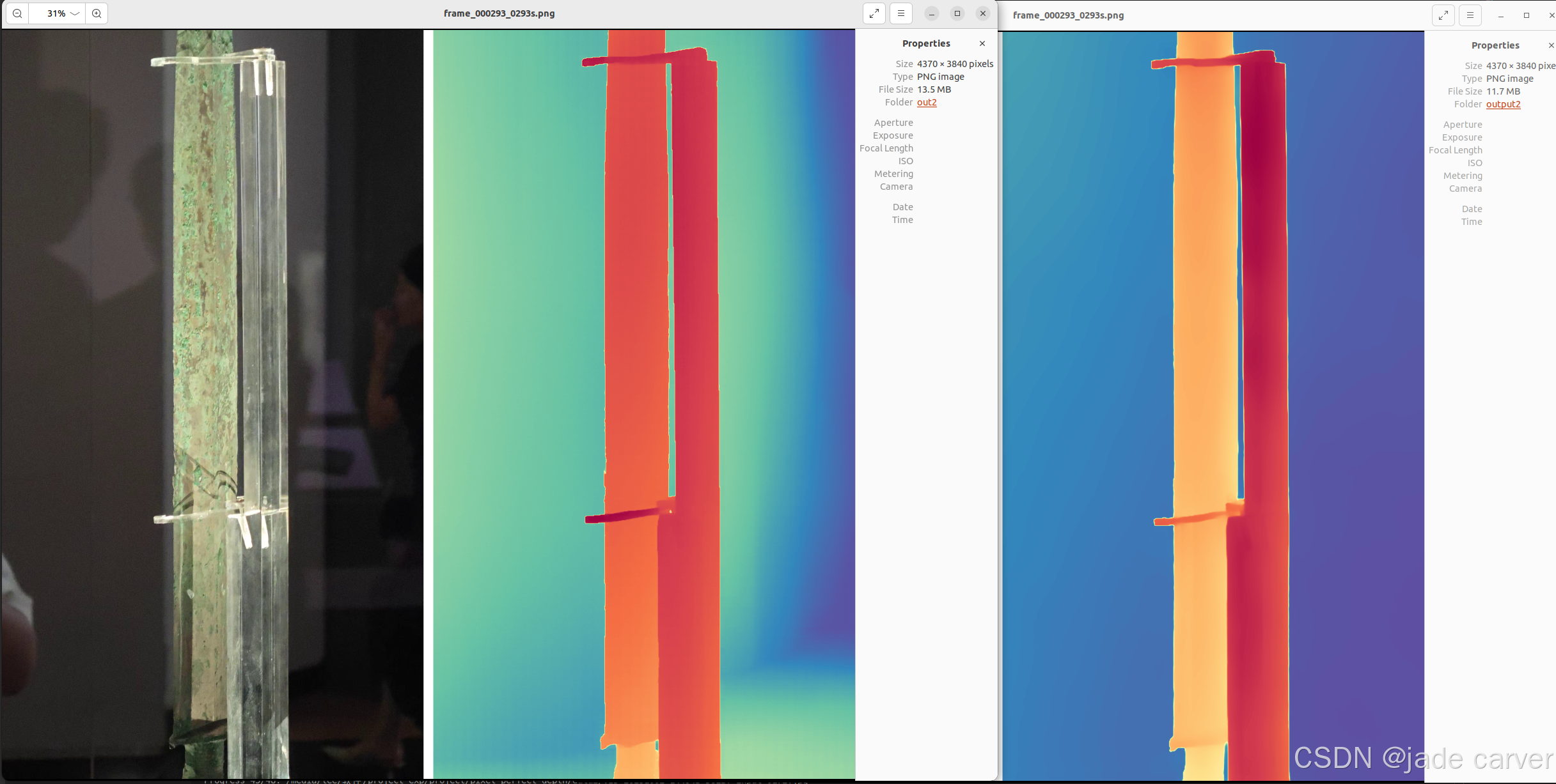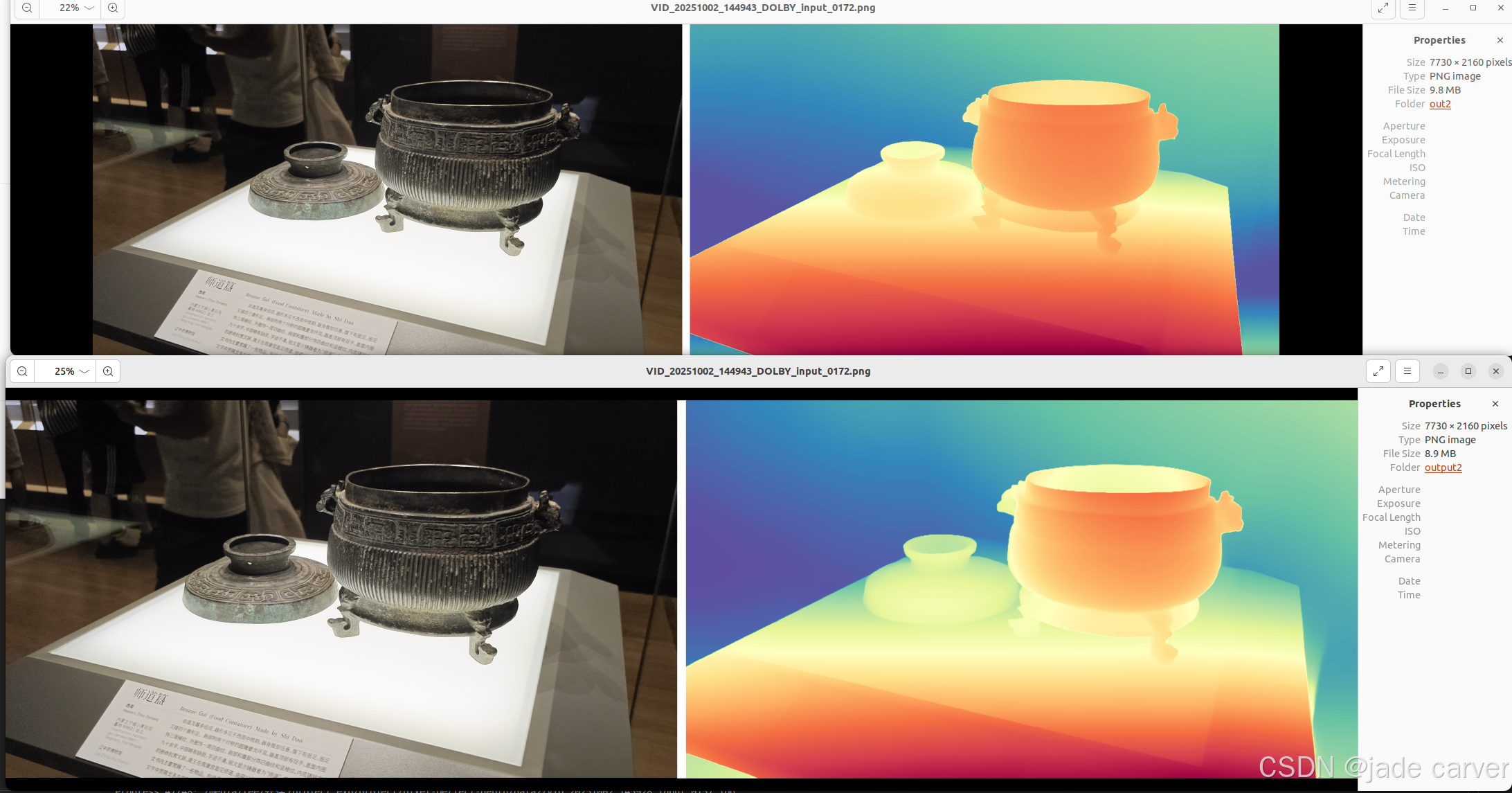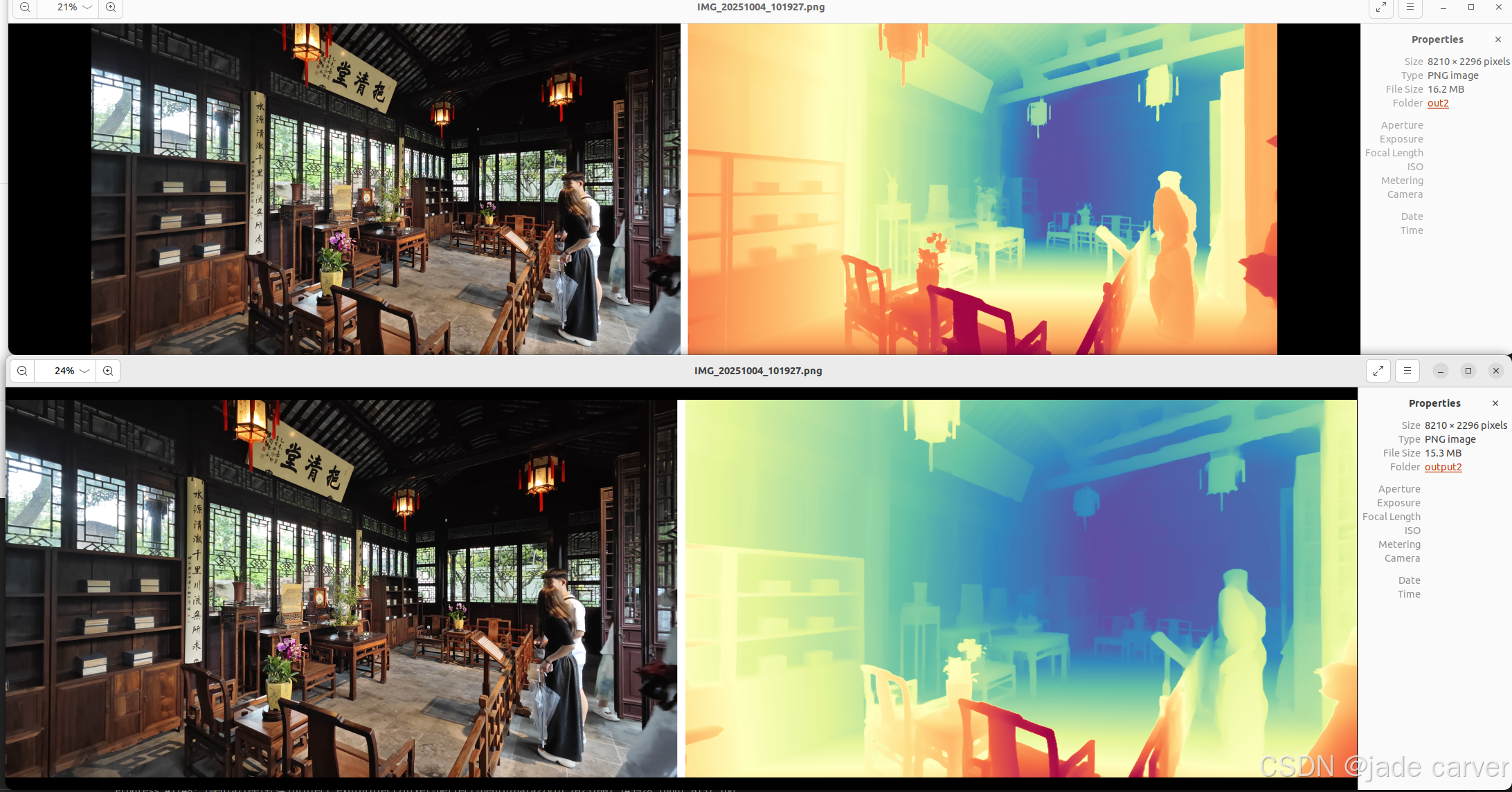 结论:同等距离水平上,本文方法在细节效果上相比depth anything v2表现较好,也就是说,只要估计得到深度值,细节上是相对较好的。但是在超远距离情况下,或者超近距离情况下,会有丢失深度的情况