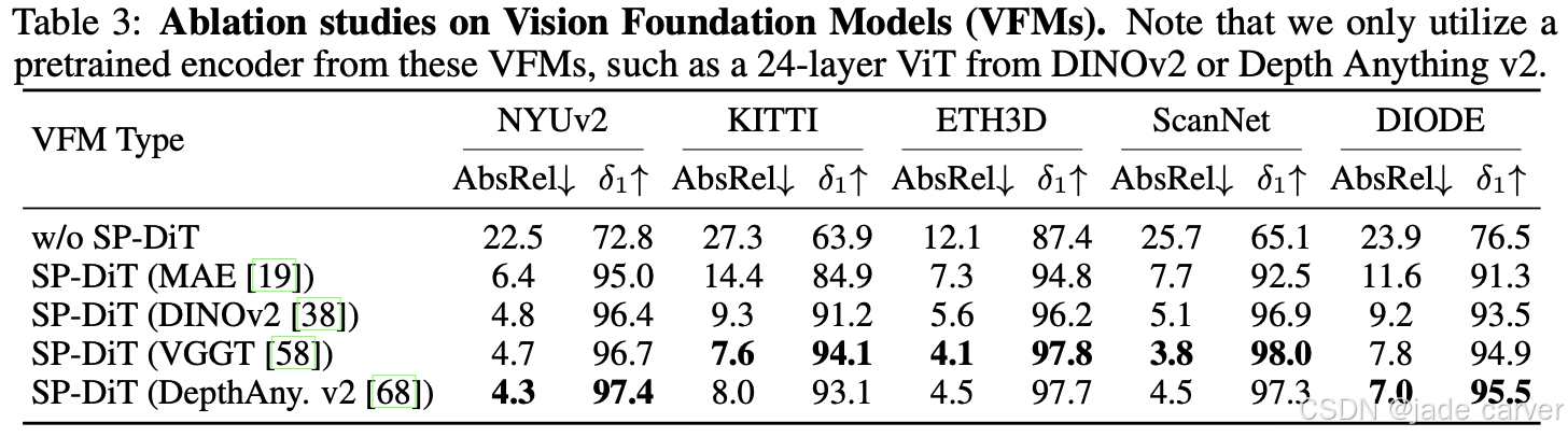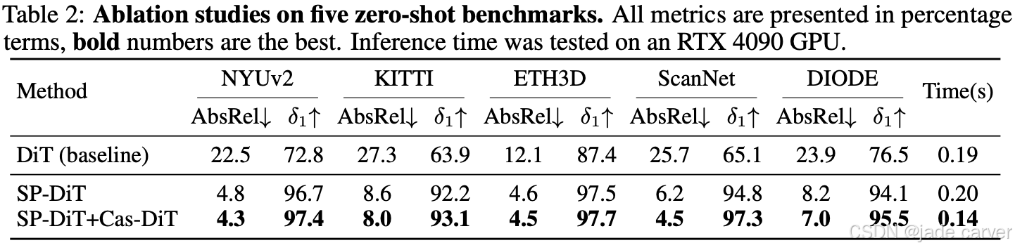 以 DiT [39] 作为基线,逐步验证各模块对性能的贡献。结果表明,直接在高分辨率像素空间进行扩散生成计算量大且优化困难,导致全局语义和细节表现不足。引入 Semantics-Prompted DiT(SP-DiT) 后,这些问题得到显著改善,例如在 NYUv2 数据集的 AbsRel 指标上提升了 78%。进一步采用 Cascaded DiT Design(Cas-DiT)的粗到细级联策略,通过逐步增加 token 数量,不仅显著提高效率(在 RTX 4090 GPU 上推理时间减少约 30%),还能更好地建模全局上下文,从而提升深度估计精度。此外,对不同视觉基础模型(MAE、DINOv2、Depth Anything v2、VGGT)的消融结果显示,SP-DiT 结合这些预训练编码器均能显著提升性能,验证了语义引导模块在模型中的有效性。