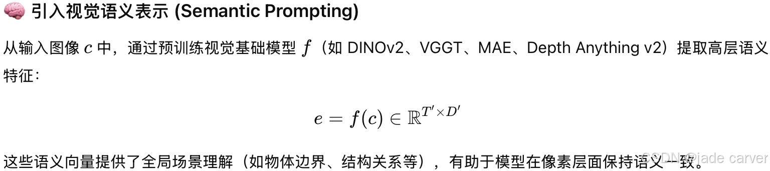 - 语义引导扩散 Transformer(Semantics-Prompted Diffusion Transformers, DiT) —— 将视觉基础模型(vision foundation models)提取的语义表征融入 DiT,以在扩散过程中提供语义提示,从而在增强细粒度视觉细节的同时,保持全局语义一致性;