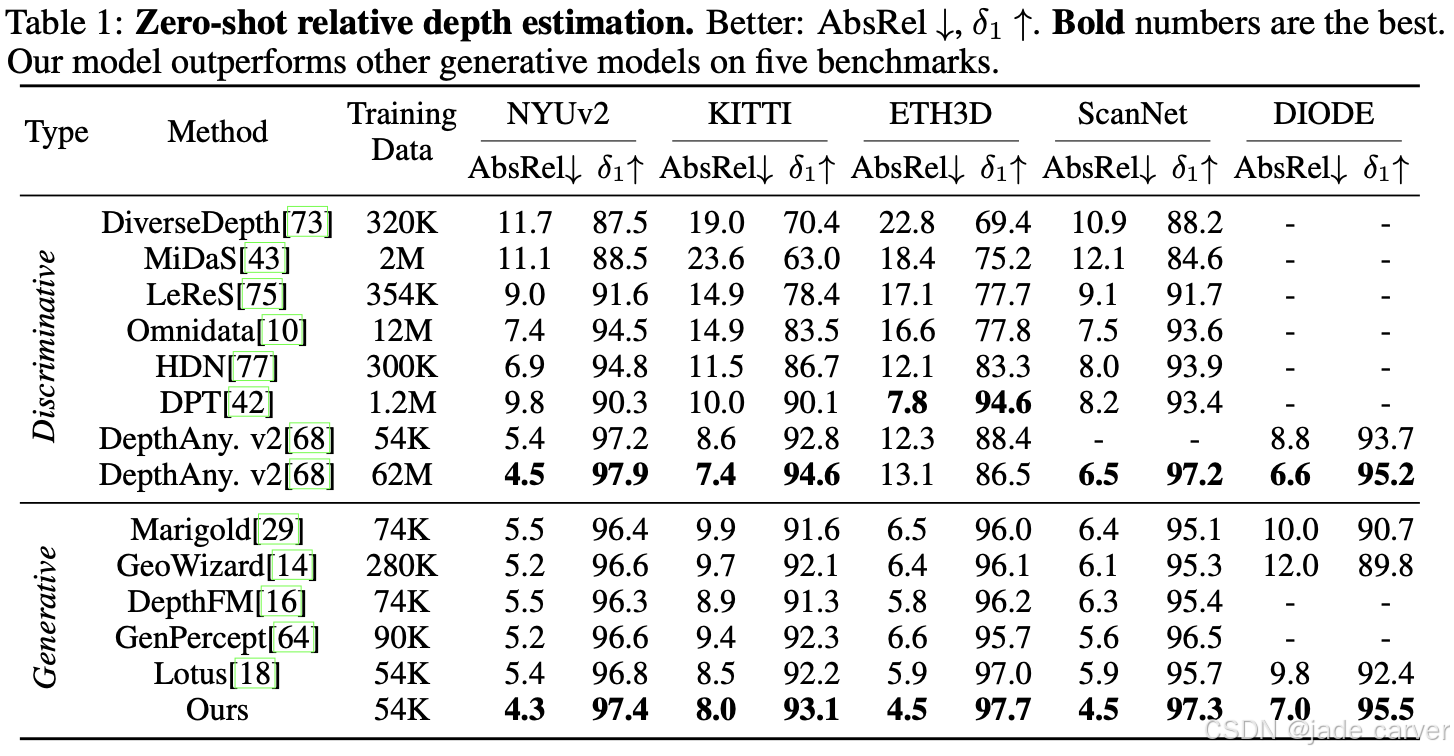 在五个基准测试中,我们的模型在所有已发表的生成式深度估计方法中表现最佳,并且在边缘感知点云评估中显著优于其他所有模型。