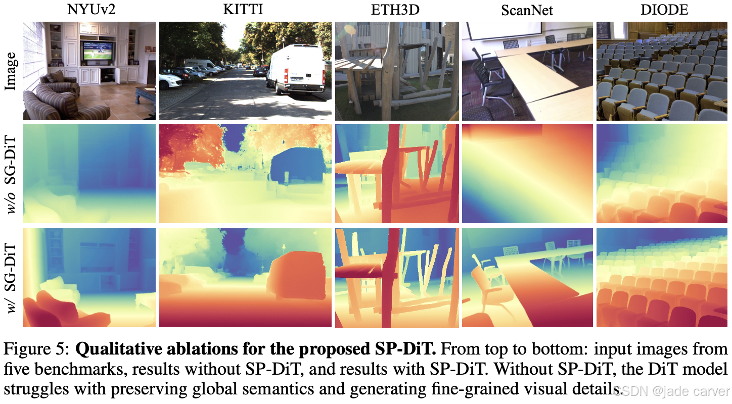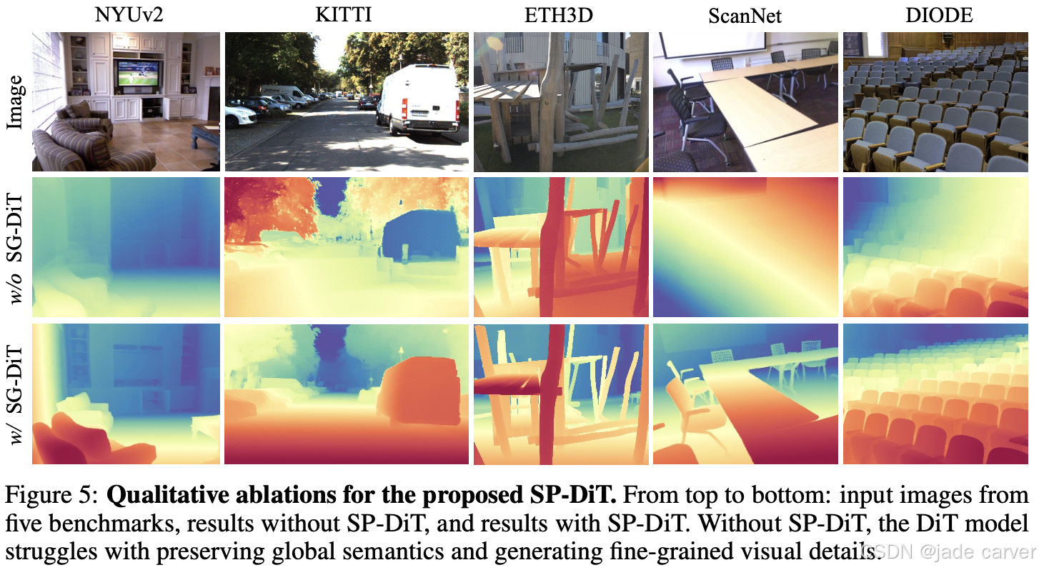 近年来,部分方法 [27, 9, 49, 47, 48, 79] 开始探索使用扩散模型(diffusion models)进行度量深度估计。然而,与这些方法不同,本文的模型聚焦于相对深度估计,在各种真实场景中展现出更好的泛化性与更精细的细节表现。尤其是本文提出的 语义引导扩散 Transformer(Semantics-Prompted DiT),将预训练的高层语义特征引入扩散过程,显著提升了模型性能。
