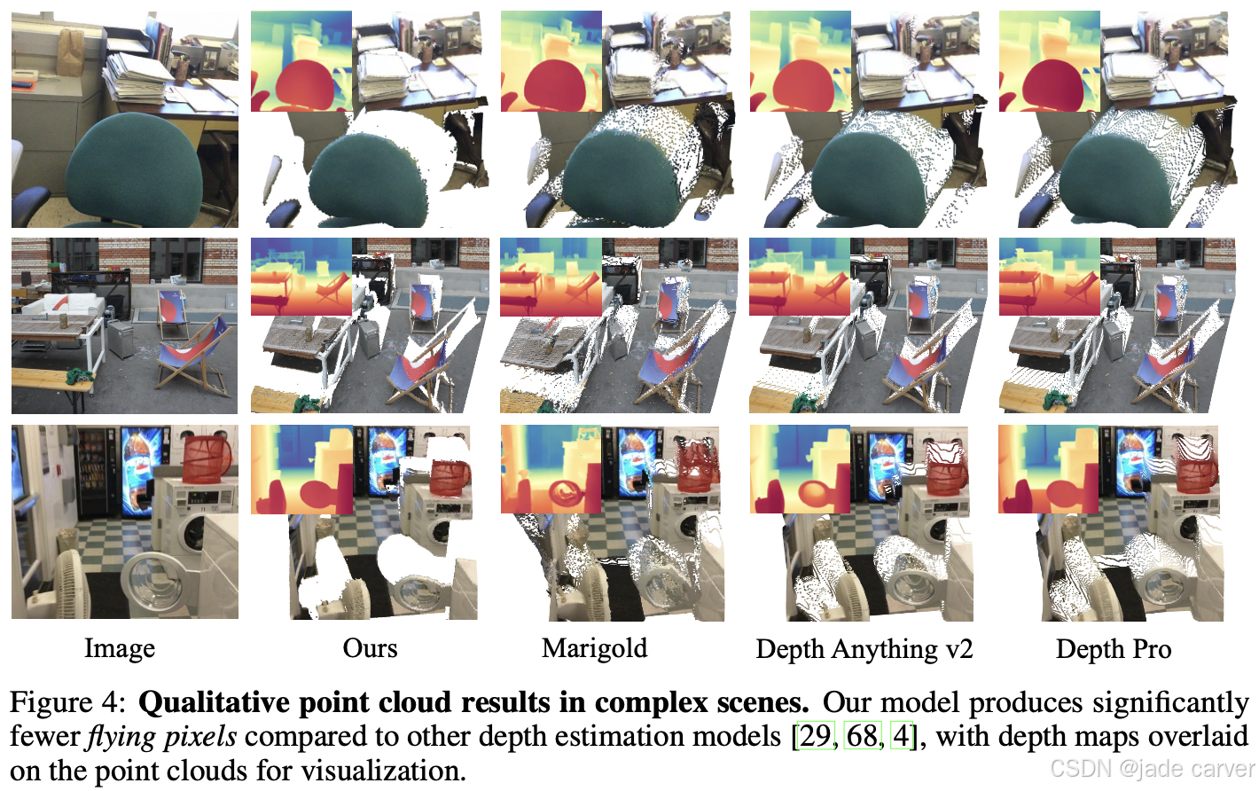 单目深度估计(MDE)是 3D 重建、新视角合成和机器人操作等任务中的核心问题。尽管现有模型在零样本场景中表现良好,但在将深度图转换为点云时常出现“飞点”(flying pixels),尤其在物体边界与细节区域。这一问题限制了模型在自由视角视频、机器人操作及沉浸式内容生成等应用中的实用性。