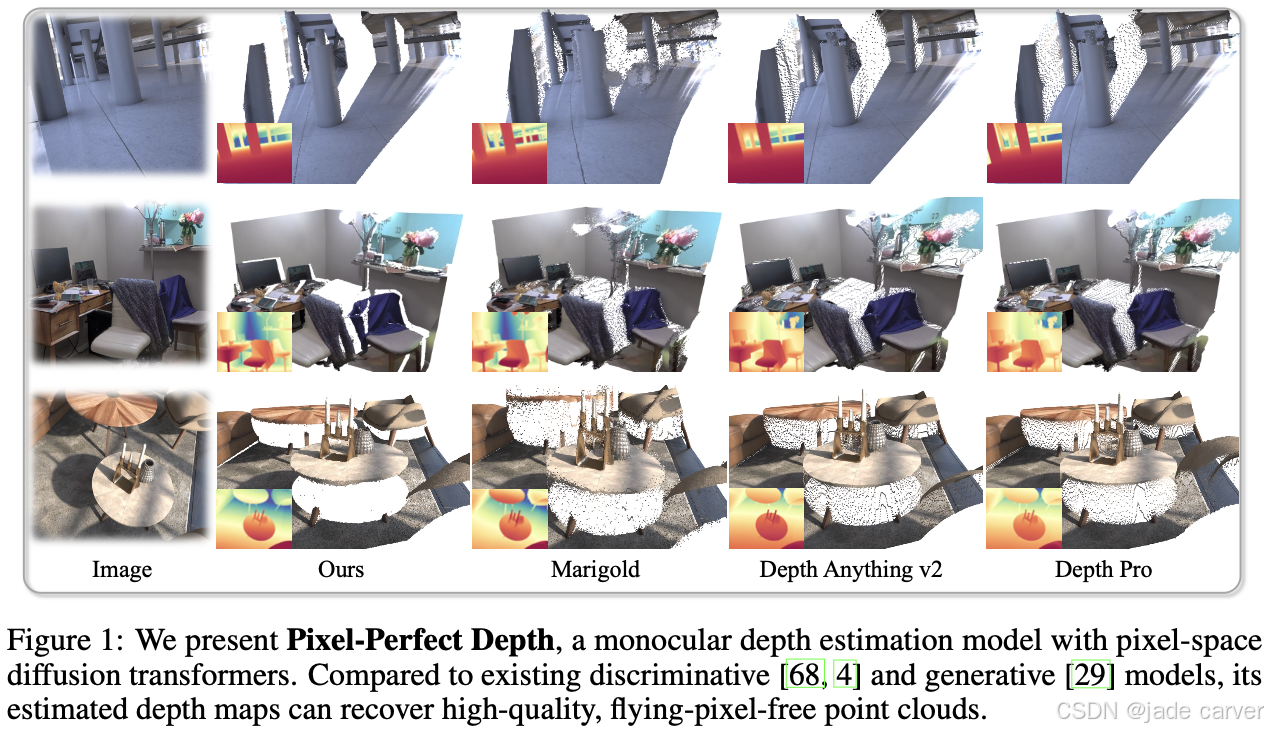 给定一张输入图像,我们的目标是估计出一张**像素级精确、在转换为点云时无飞点(flying pixels)的深度图。现有模型 [29, 14, 18, 68, 4] 通常由于各自的建模范式存在内在缺陷而产生飞点问题。