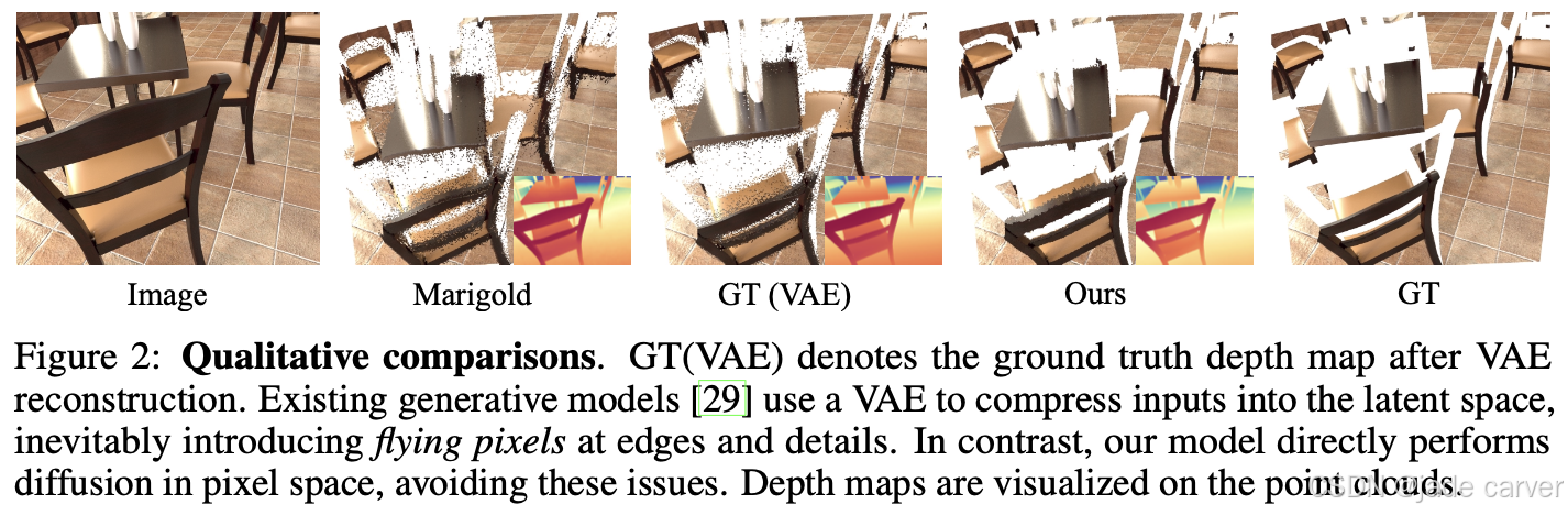 本文的深度在像素空间而非潜空间中执行扩散生成。这种方式能够直接建模像素级的深度分布,尤其是物体边缘的深度不连续性。