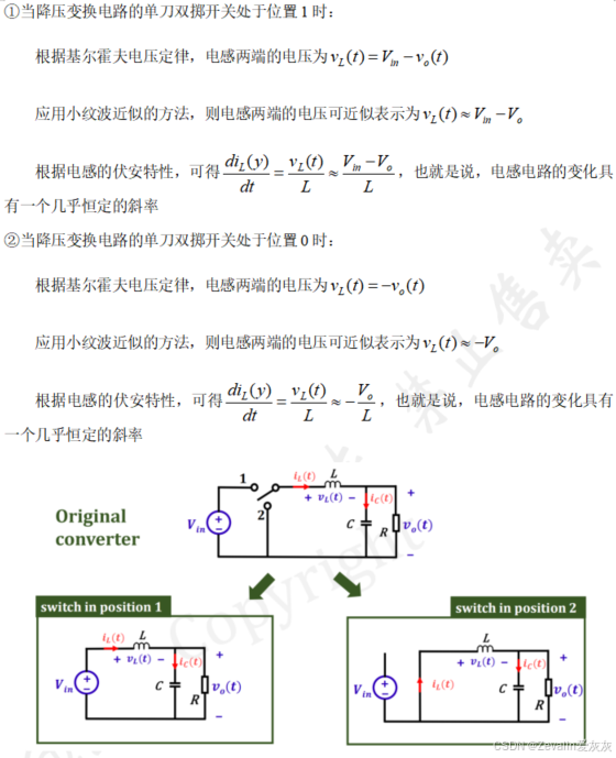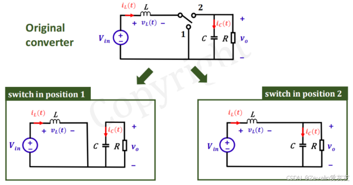 (1)电路中的开关元件状态不同,那么相应状态下的电路也会有所差别,要想分析整个电路,可以根据开关元件状态画出每个状态下对应的电路,逐个分析,以下继续以上一章的降压变换电路(Busk电路)为例进行分析。