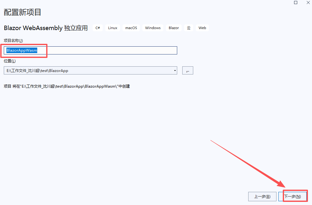 - 在“配置新项目”窗口中,输入 BlazorAppWasm 作为项目名称,然后选择“下一步”。