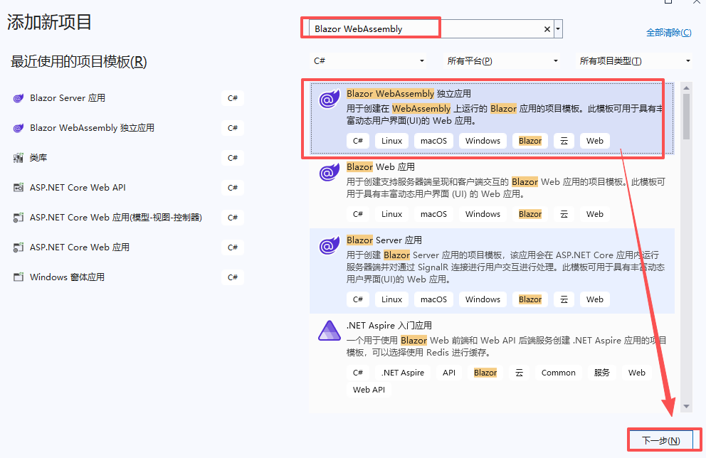 - 在“创建新项目”窗口中,在搜索框中键入 Blazor WebAssembly,然后按 Enter。