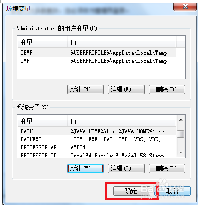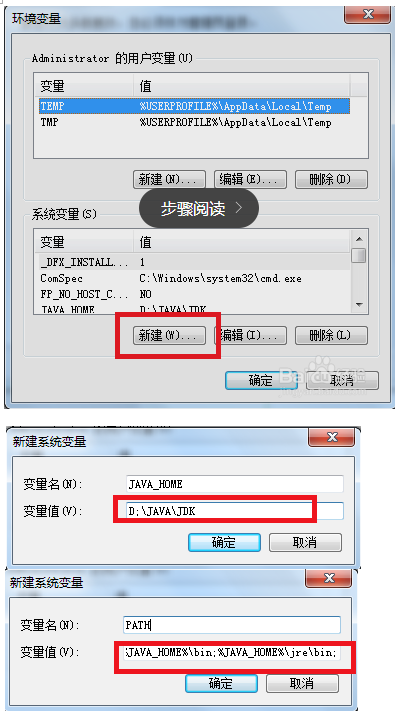 5、点击环境变量后出现如下图一所示,在系统变量下面点击新建,然后在下图二弹窗中输入以下内容,变量值就是在步骤4里设置的路径,我的是D:\JAVA\JDK,所以就设置成这个。设置完后再重复刚才步骤新建一个系统变量如下图三,这个可以和我设置一样,变量值为“%JAVA_HOME%\bin;%JAVA_HOME%\jre\bin;”。设置好后别忘了确定呀,如下图四。