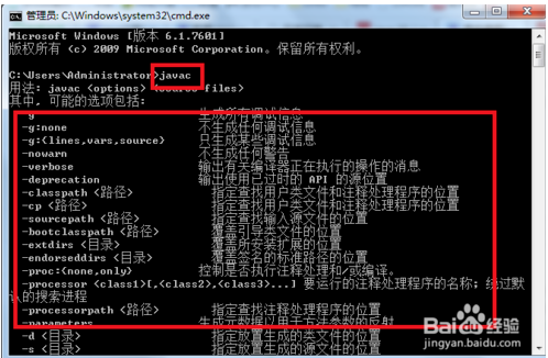 6、一切大功告成。但怎么样才能确定安装成功了呢?点击windows图标,在命令行中输入cmd,如下图一,按回车键。就会出现一个命令窗口(一个黑色的框框),再输入“javac”按回车键,如果出现如下图二就真的大功告成了,如果没有就重温下以上的步骤。
