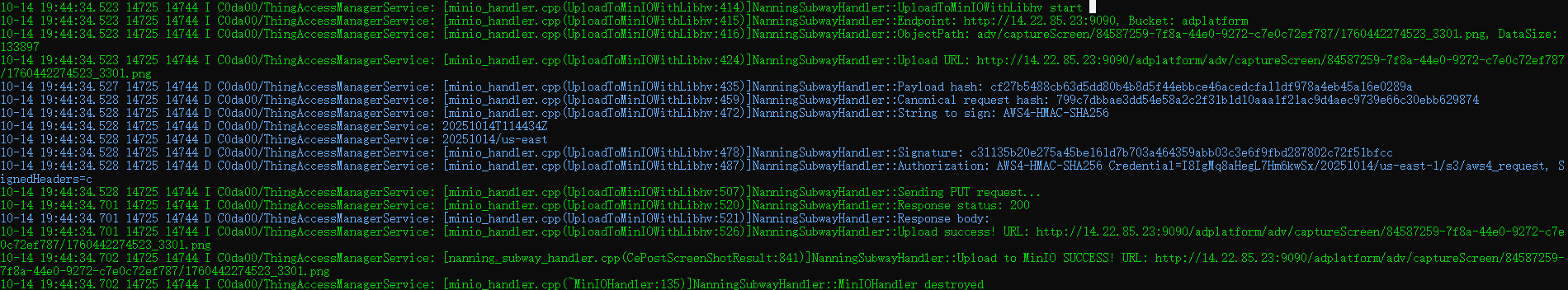 }bool MinIOHandler::UploadScreenshot(const std::string& screenShotId,const std::string& screenShotName,const std::string& screenShotDataBase64,std::string& outImageUrl) {NN_LOGI("UploadScreenshot: screenId=%{public}s, name=%{public}s, base64Size=%{public}zu",screenShotId.c_str(), screenShotName.c_str(), screenShotDataBase64.size());if (screenShotDataBase64.empty()) {NN_LOGE("Base64 data is empty");return false;}// Base64 解码NN_LOGI("Decoding Base64 data...");std::string binaryData = Base64Decode(screenShotDataBase64);NN_LOGI("Decoded binary size: %{public}zu bytes", binaryData.size());if (binaryData.empty()) {NN_LOGE("Base64 decode failed");return false;}return UploadBinaryData(screenShotId, screenShotName, binaryData, outImageUrl);