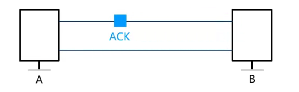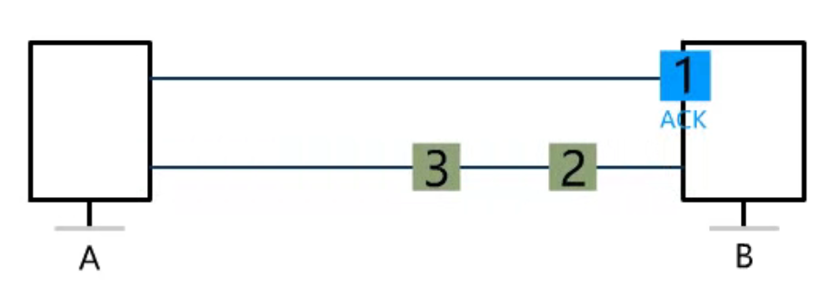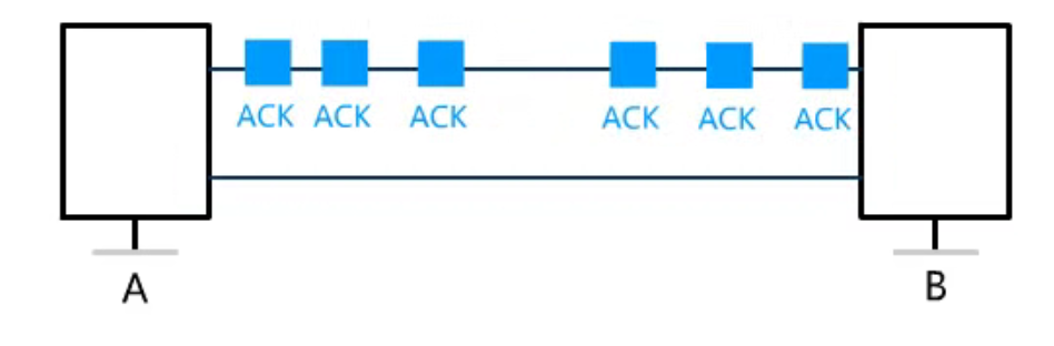 于是你设计了如下方案,A 每发一个包,都必须收到来自 B 的确认(ACK),再发下一个,否则在一定时间内没有收到确认,就重传这个包。
