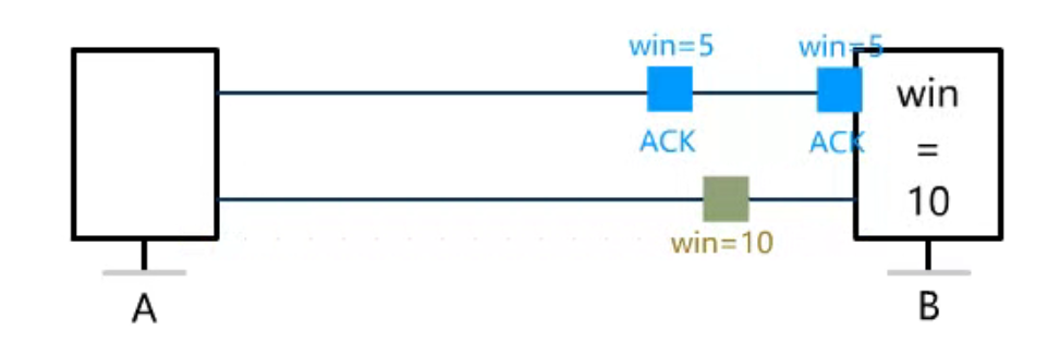 于是 B 决定,每次发送数据包给 A 时,顺带传过来一个值,叫窗口大小(win),这个值就表示 B 的接收能力。同理,每次 A 给 B 发包时也带上自己的窗口大小,表示 A 的接收能力。