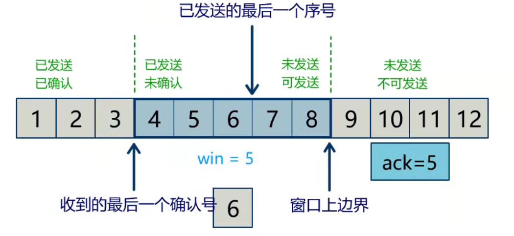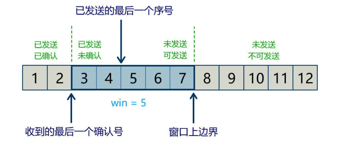 当 A 不断发送数据包时,已发送的最后一个序号就往右移动,直到碰到了窗口的上边界,此时 A 就无法继续发包,达到了流量控制。