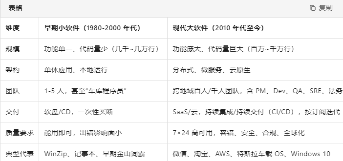 小软件“写完就卖”,版本少;大软件“永远 Beta”,日均千次构建,自动化测试用例百万级。