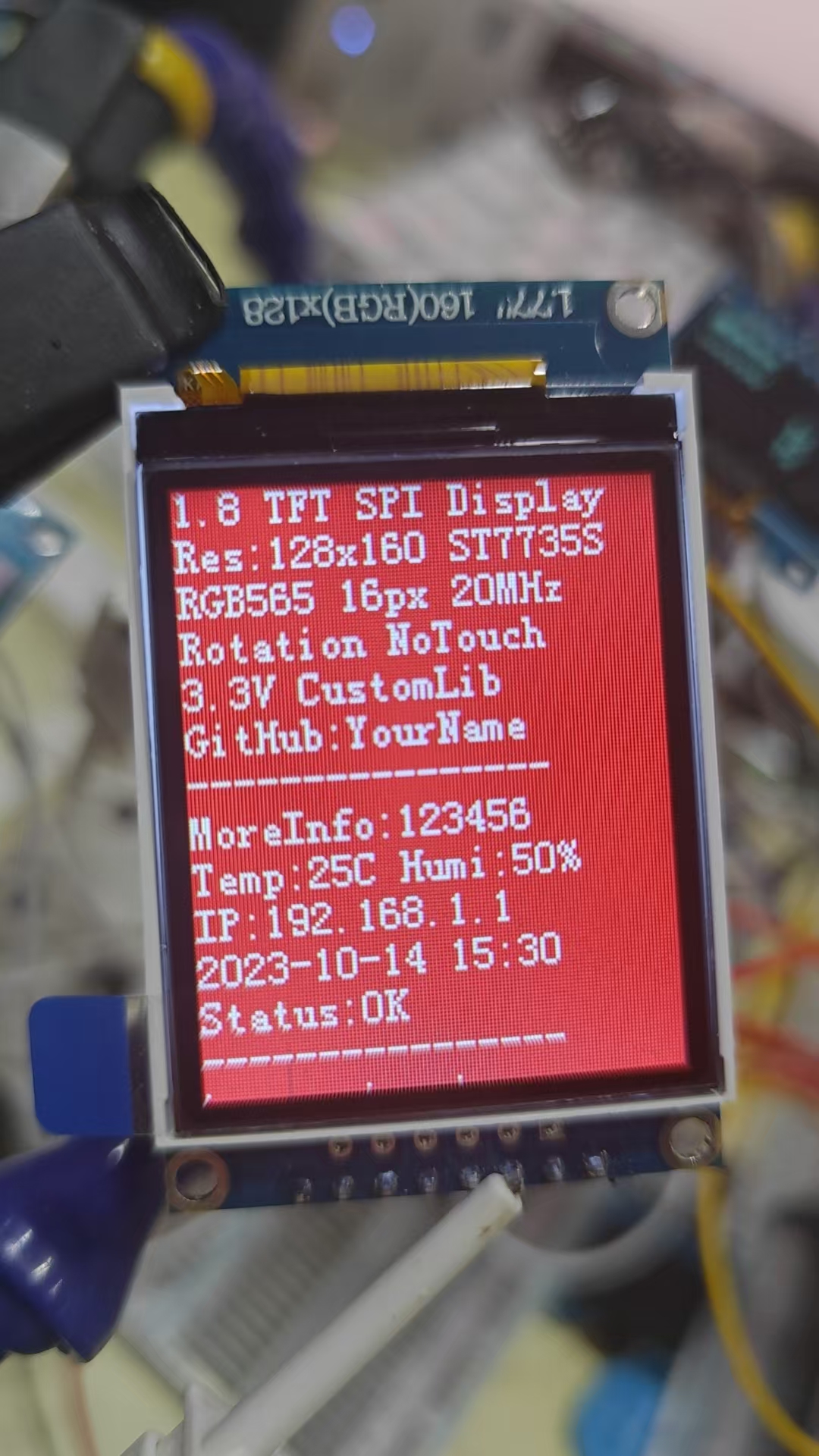 LCD_Init(); POINT_COLOR=WHITE;//设置字体为白色 LCD_ShowString(0,0,128,12,12,(u8*)"1.8 TFT SPI Display");LCD_ShowString(0,12,128,12,12,(u8*)"Res:128x160 ST7735S");LCD_ShowString(0,24,128,12,12,(u8*)"RGB565 16px 20MHz");LCD_ShowString(0,36,128,12,12,(u8*)"Rotation NoTouch");LCD_ShowString(0,48,128,12,12,(u8*)"3.3V CustomLib");LCD_ShowString(0,60,128,12,12,(u8*)"GitHub:YourName");LCD_ShowString(0,72,128,12,12,(u8*)"----------------");LCD_ShowString(0,84,128,12,12,(u8*)"MoreInfo:123456");LCD_ShowString(0,96,128,12,12,(u8*)"Temp:25C Humi:50%");LCD_ShowString(0,108,128,12,12,(u8*)"IP:192.168.1.1");LCD_ShowString(0,120,128,12,12,(u8*)"2023-10-14 15:30");LCD_ShowString(0,132,128,12,12,(u8*)"Status:OK");LCD_ShowString(0,144,128,12,12,(u8*)"----------------");LCD_ShowString(0,156,128,12,12,(u8*)"End of Display");