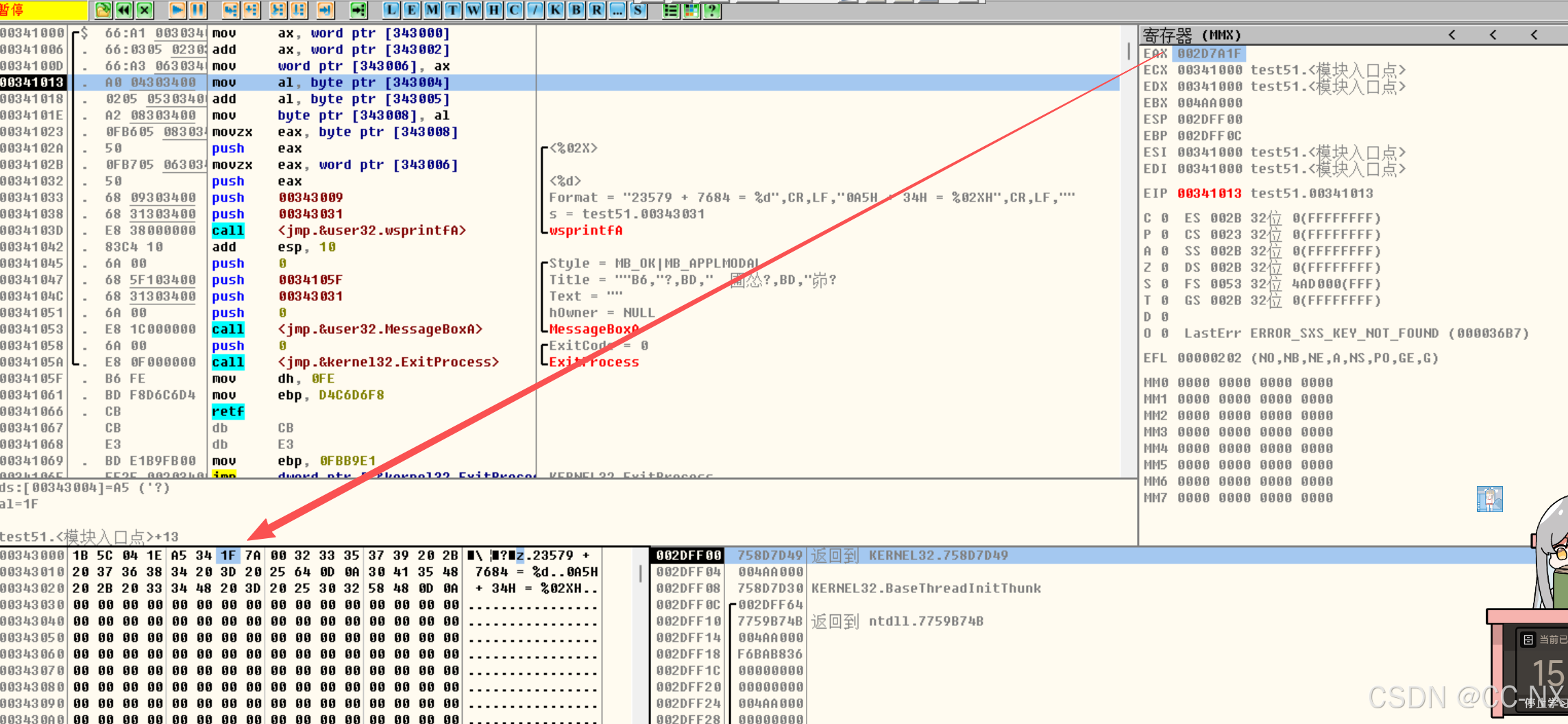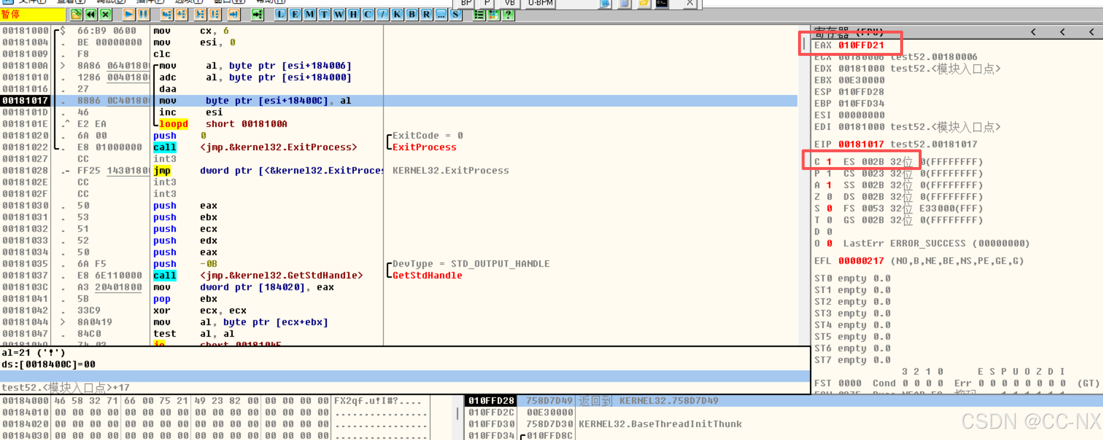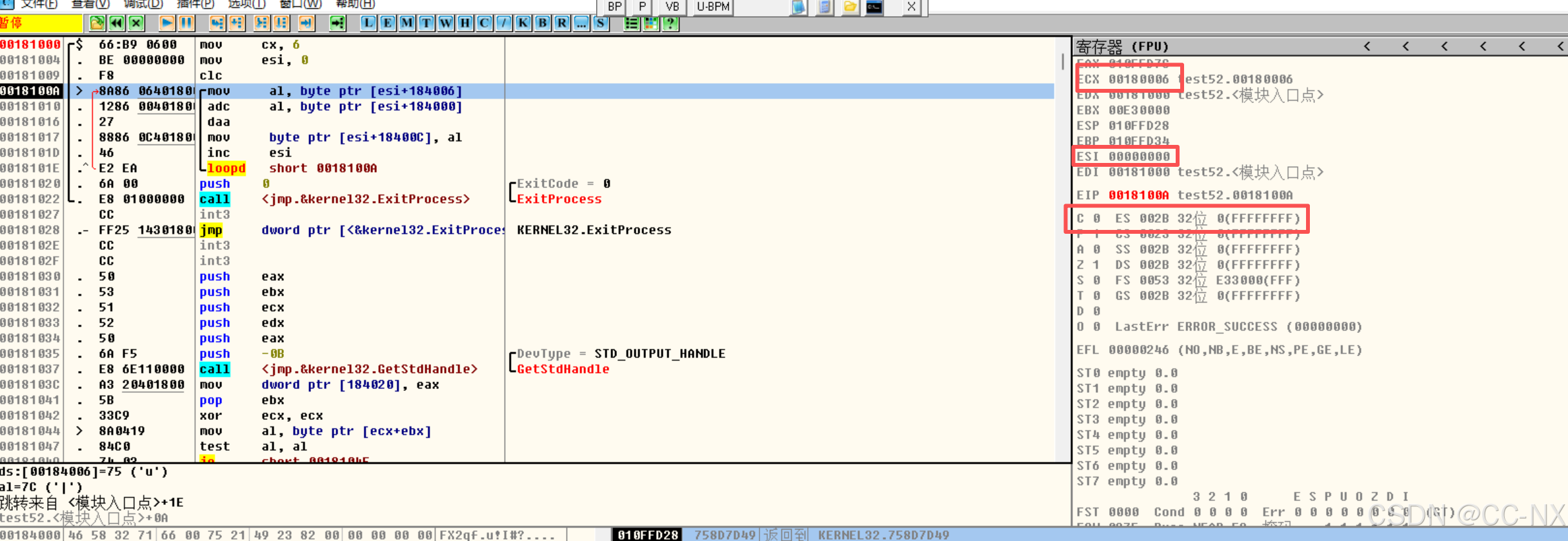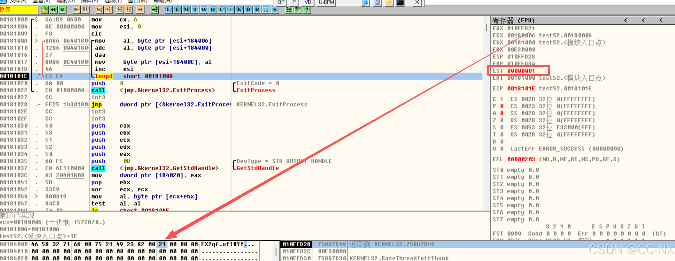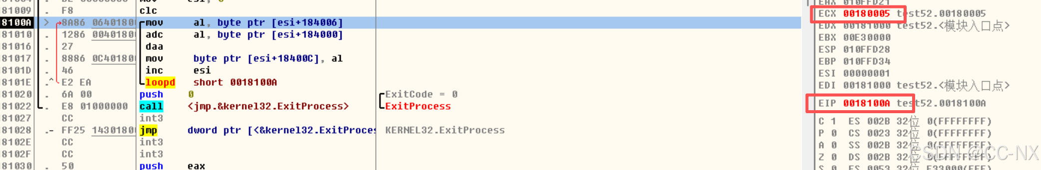此后循环依次执行,我们发现该代码并没有直接退出循环,问题为ECX≠0,我们只把CX置0,修改后程序正常6此后退出循环,得到我们相加后的数值